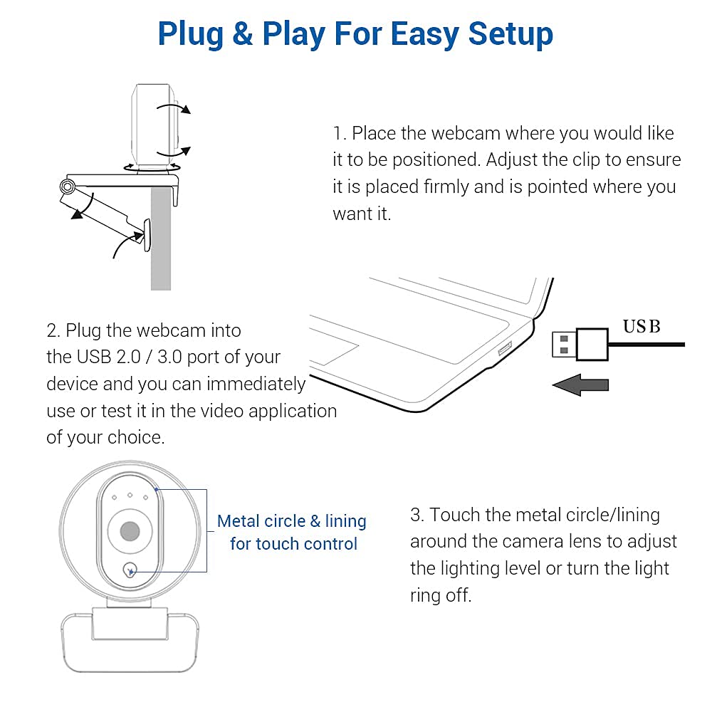 【Plug & Play】The NexiGo N680E with ring light works with USB 2.0/3.0. No additional drivers or software required. The mounting clip can be placed on any: desktop / monitor / laptop / Chromebook / tripod / or any flat surface.
