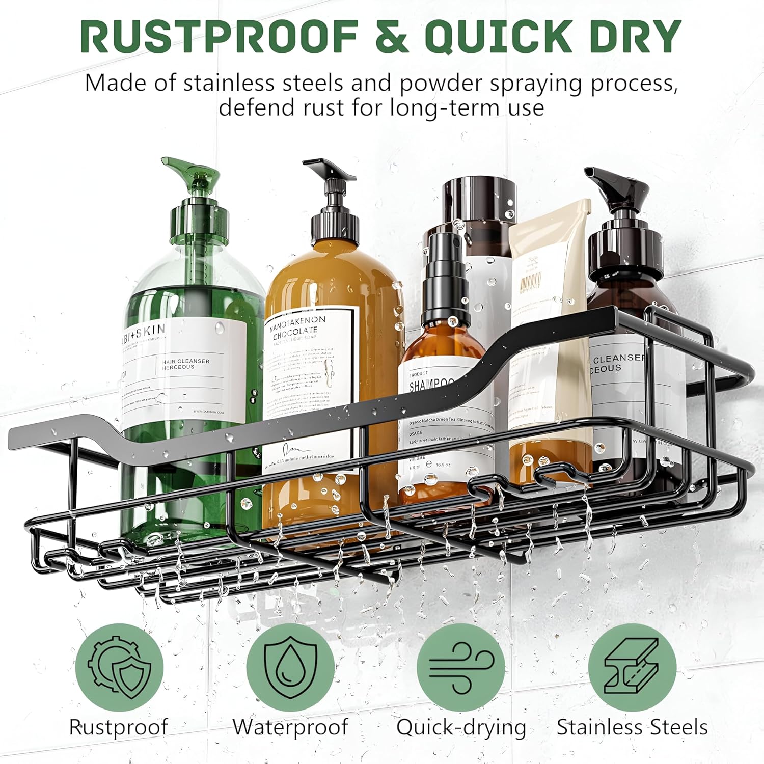 Stronger Adhesive for Easy Installation,No Drilling:Installation only takes a few minutes, requiring no drilling holes or any tools and doing no damage to the wall. Clean the surface, stick the adhesives to the wall, and hang the shower shelves to use. Suitable for smooth surfaces like tiles/marble/glass/metal, but not for uneven surfaces like painted walls.