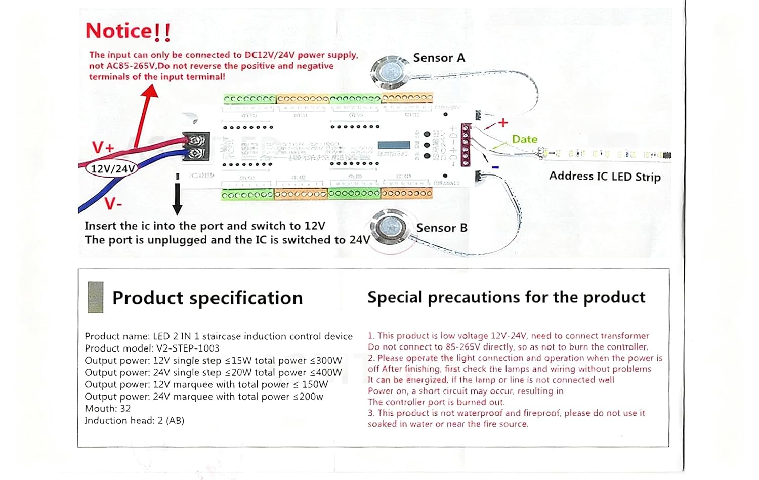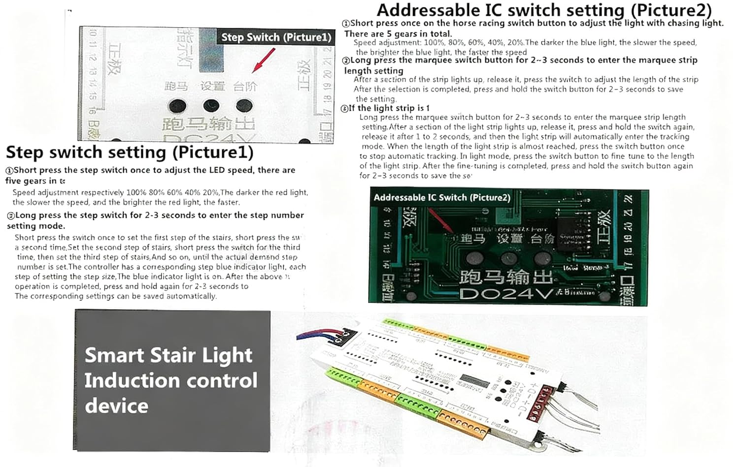 Number of Steps Supported: 36 steps per controller (expandable to 72 with cascading)Lighting Modes: 7 dynamic modes including follow, running, gradual glow, full-step illuminationMotion Sensor Range: 30 meters detection distance (can vary with placement)Sensor Type: PIR motion sensor + daylight sensor for automatic operationPower Input: AC100-240VController Output: DC12-24V for LED stripsLED Strip Compatibility: Supports addressable RGB LED strips & monochrome LED stripsInstallation: Easy to connect and install without messy wires showing.Material & Build: Durable ABS housingSpecial Features: Soft start + soft fade-out, direction run feature, night mode minimum brightness.