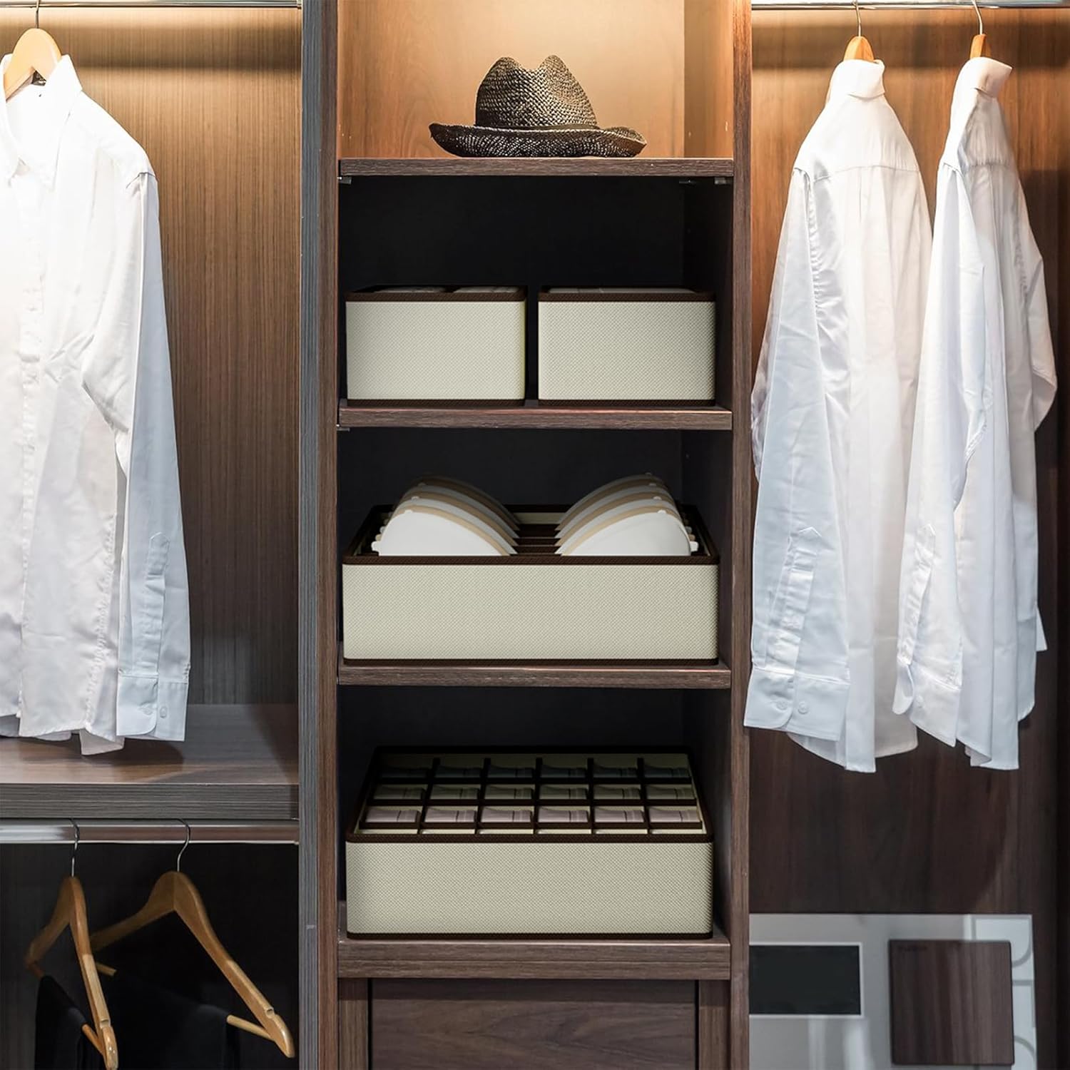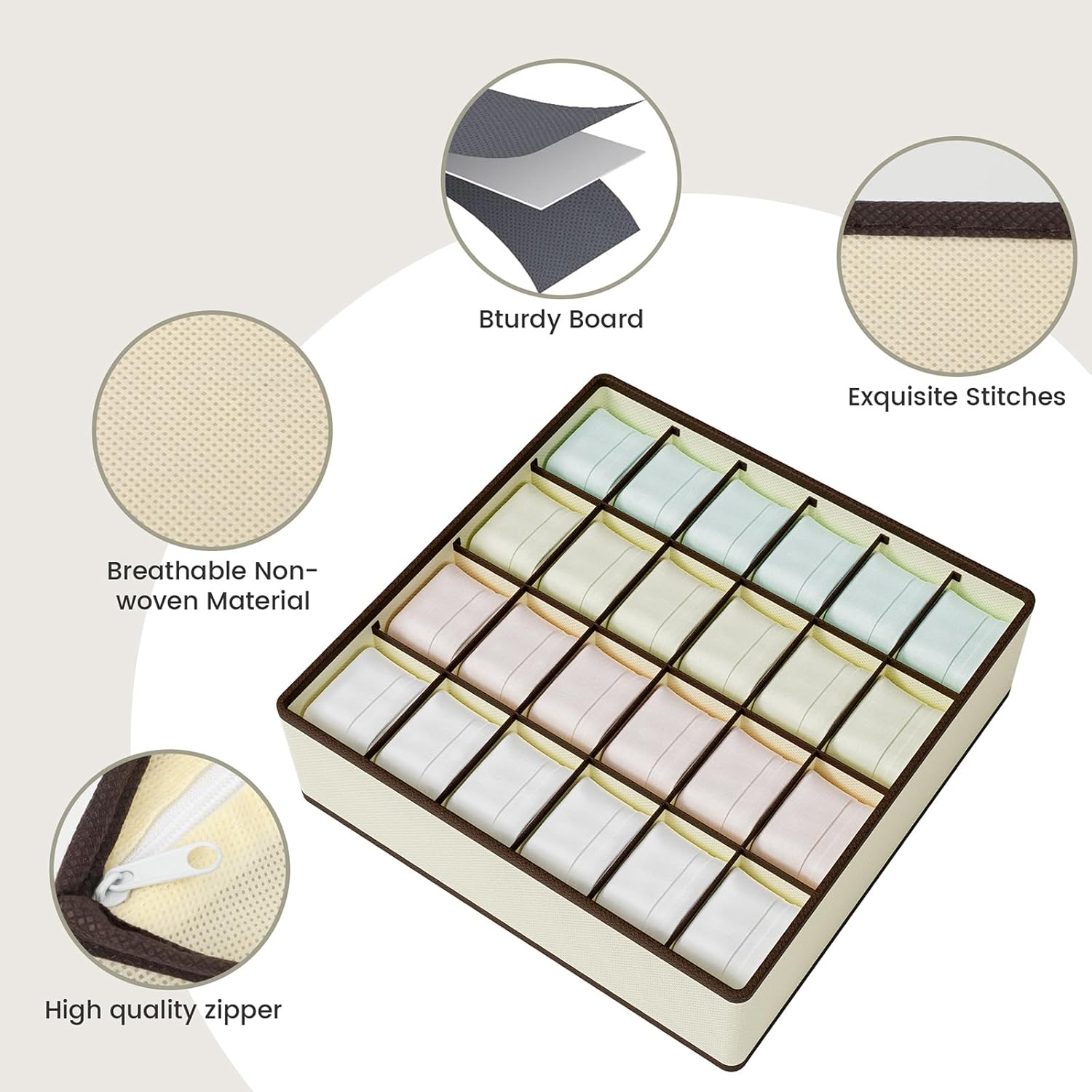 Good for organizing your lingerie, socks, underwear when you finish laundry and easy to access them while you need it. Made with non-woven fabric. The item includes 4 bins: 6 cell(scarves, ties), 8 cell(underwear, briefs, ties), 7 cell(bra), 24 cell(socks)Closet Underwear Organizer Drawer Divider 4 Set