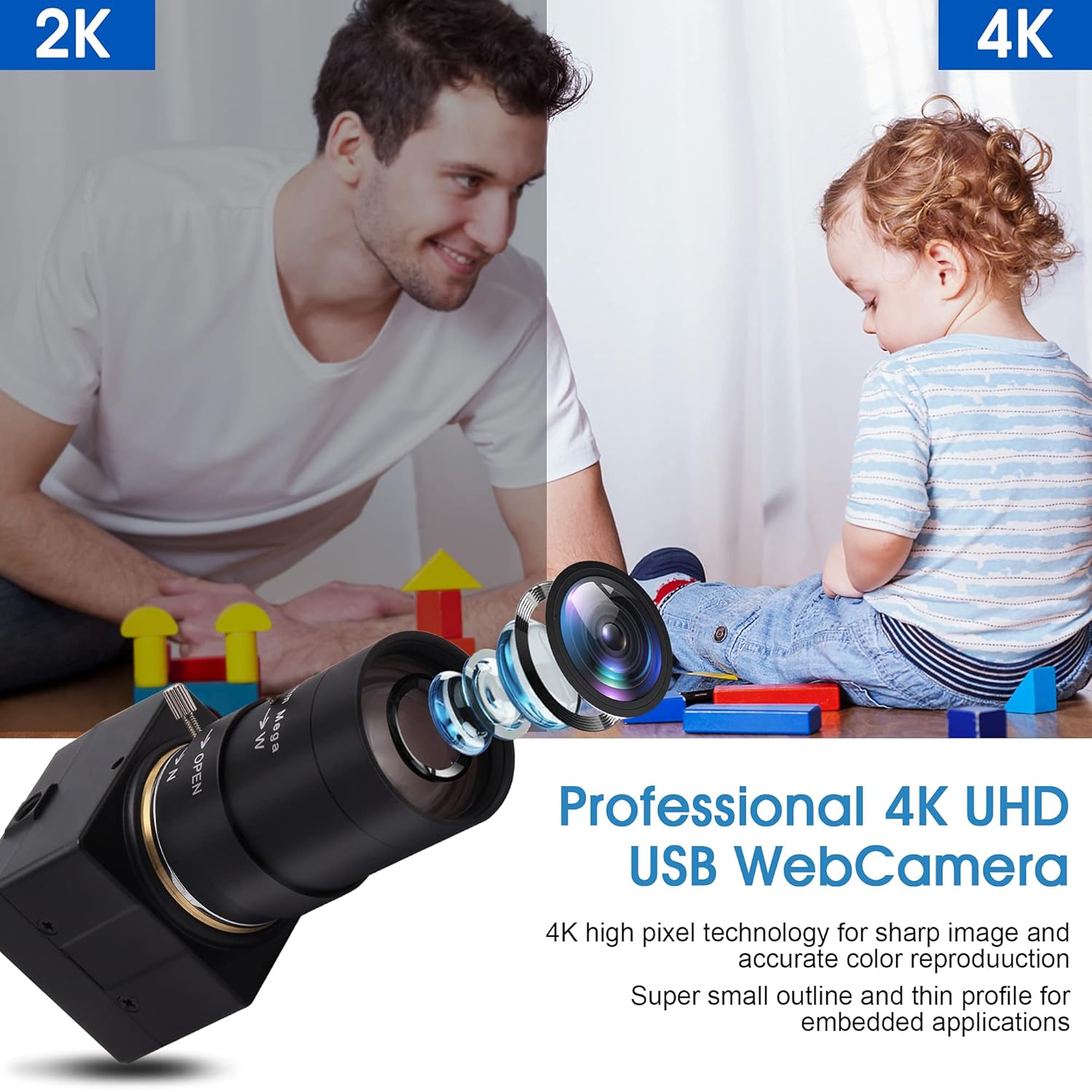 Advanced Sony (1/2.8” ) IMX415 Image Sensor: 4K usb camera come with sony (1/2.8” ) IMX415 image sensor. 5-50mm manual varifocal lens can provide crystal clean image. Mini usb web cam is specially designed and optimized for professional high standard medical industry requirements, great for video conferencing, webinars, Industrial camera, 3D scanner, VR camera, biological microscope, box inside surveillance, micro HDsurveillance, endoscope, Medical auxiliary equipment, etc.