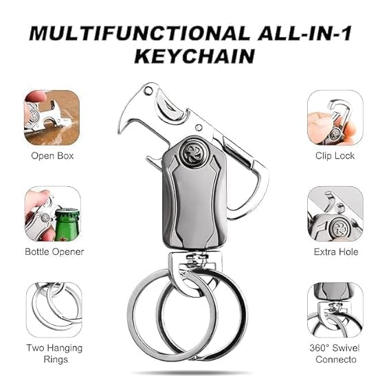 Multifunctional Design: Combines a carabiner, bottle opener, phone holder, and fingertip gyro for ultimate convenience.Stylish & Versatile: Sleek design complements various outfits and is perfect for both casual and business occasions.360° Rotation: Easily access your keys and enjoy the fun of the rotating feature to relieve stress and tension.Durable Material: Made from high-quality electroplated zinc alloy, ensuring oxidation, wear, and rust resistance for lasting use.Ideal Gift: A thoughtful present for friends and family, suitable for men and women drivers, and perfect for any occasion.