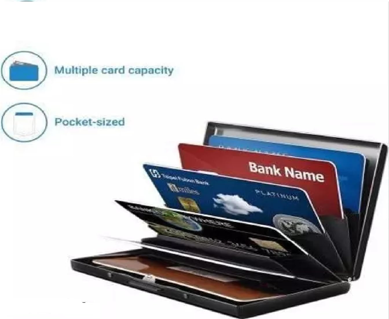 THE FITS: The metal wallet size is 9.5x 6.5 x 1.2 cm, very slim, fit for the credit cards, with compact folding accordion holders that make the cards not easy to fall off. The 6 cards capacity to meet the daily needs of carrying your usual cards but 6-card are best
