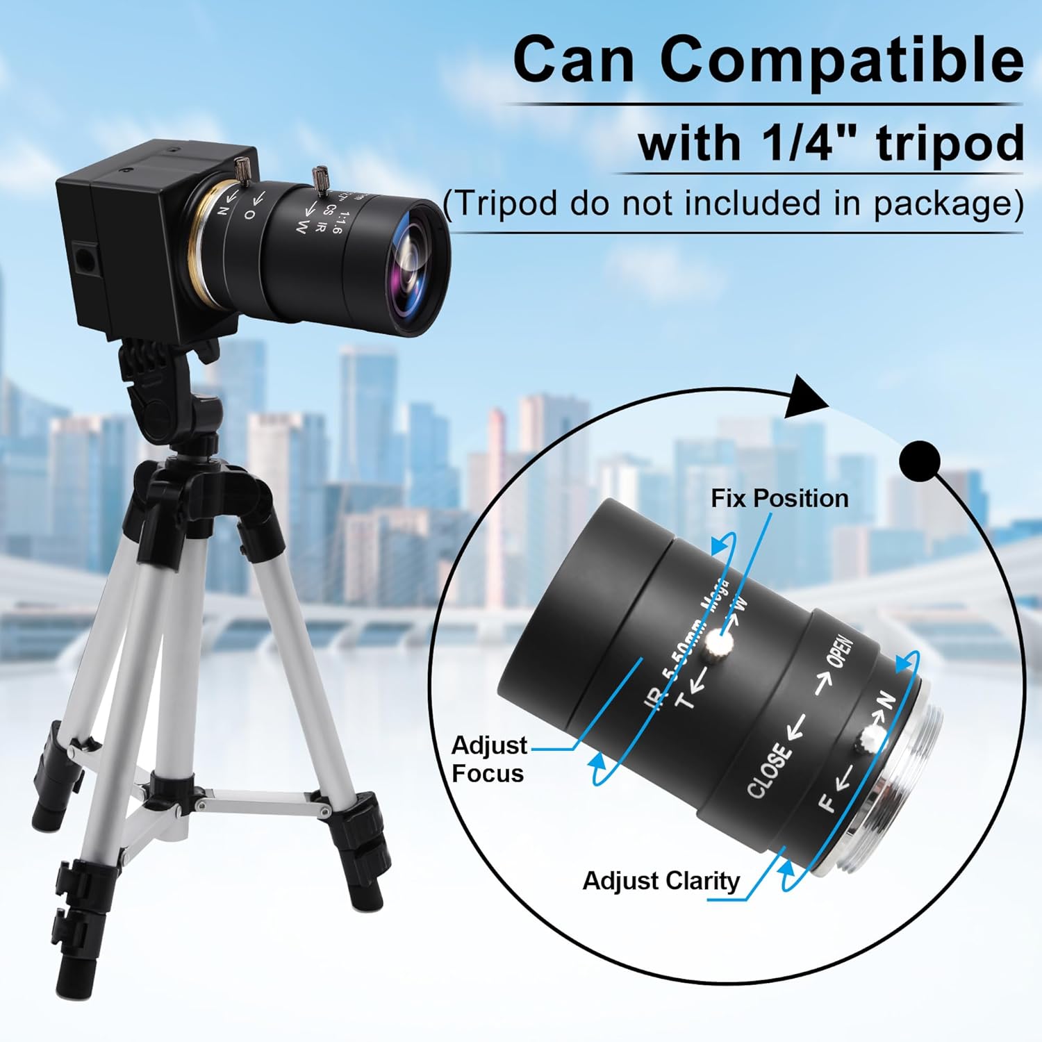 【Sensor】8 megapixel mini webcam is the high standard in terms of image quality and sensitivity performance. 5-50mm varifocal lens usb camera with IR-cut filter@650nm for true color day images/videos (Does not work with 850nm IR illumination), focus adjustable. Max Resolution:3264(H)X2448(V): High Definition 1024×768@30fps/3200×2400@ 20fps/3264X2448@15fps. Perfect for high level video system for personal or industrial.
