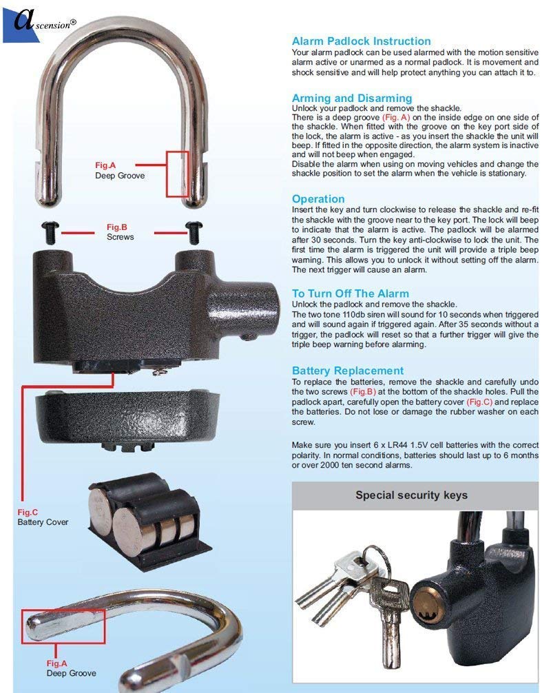 Operating Instruction : Insert key; turn in a clockwise direction and remove shackle,Replace shackle into lock with groove towards key and the alarm will set after 15 second. When the lock is vibrated twice within 5 seconds the alarm will sound. The 5 second delay allows the lock to be opened by key without sounding. The alarm sounds in 10 second intervals. The alarm will keep sounding with constant movementor vibration. Once stopped the alarm will re-set after 35 seconds.