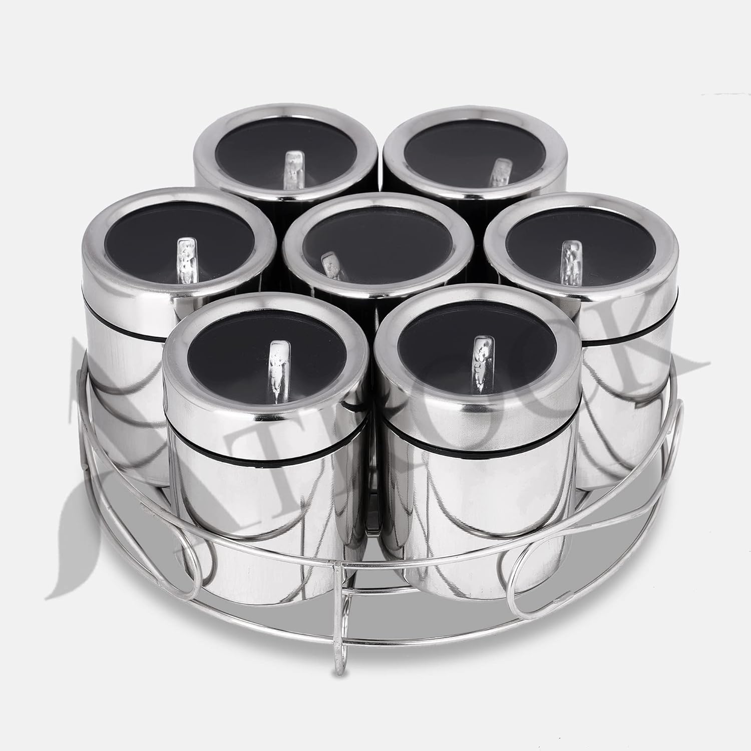 ATROCK Masala Box Container For Kitchen | Grocery Containers| Masala Dabba| Spice Storage Container| Jars & Containers| Masala Dani with 7pcs Stainless Steel Spoon| Set of 7 Containers with Steel Stand (Steel, Silver)