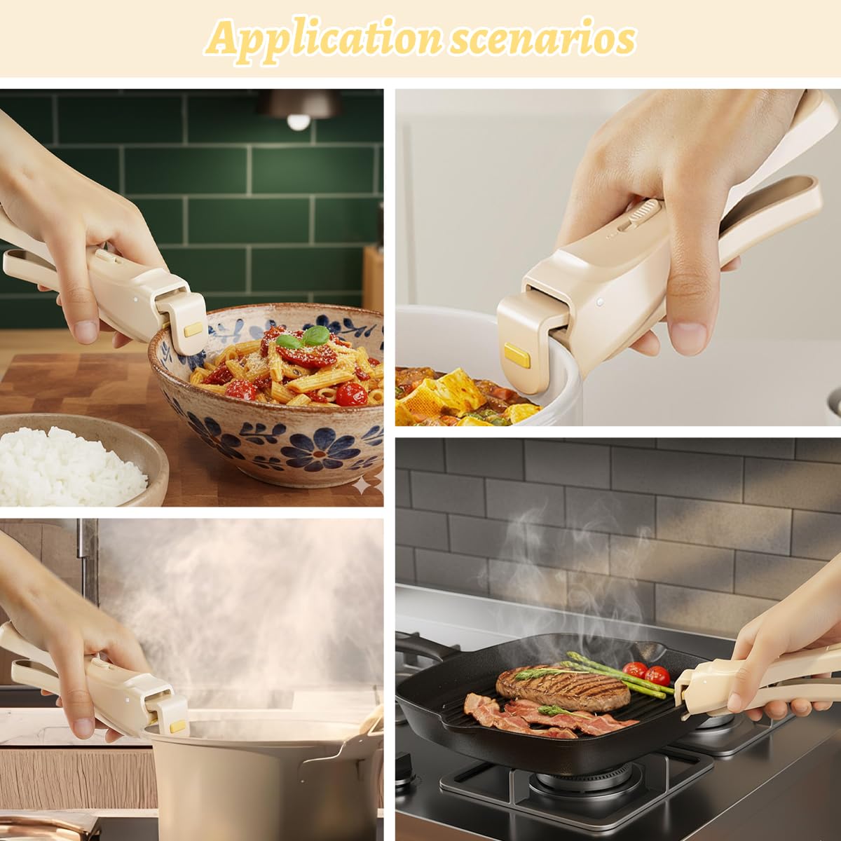Broad Cookware Compatibility: The adjustable clip-on mechanism fits most pots, pans, saucepans, Dutch ovens, baking dishes, and bowls with a detachable handle base or a rim thickness between 0.5–2cm. It’s compatible with both non-stick, stainless steel, cast iron, ceramic, and glass cookware—making it a one-size-fits-most solution for any kitchen.