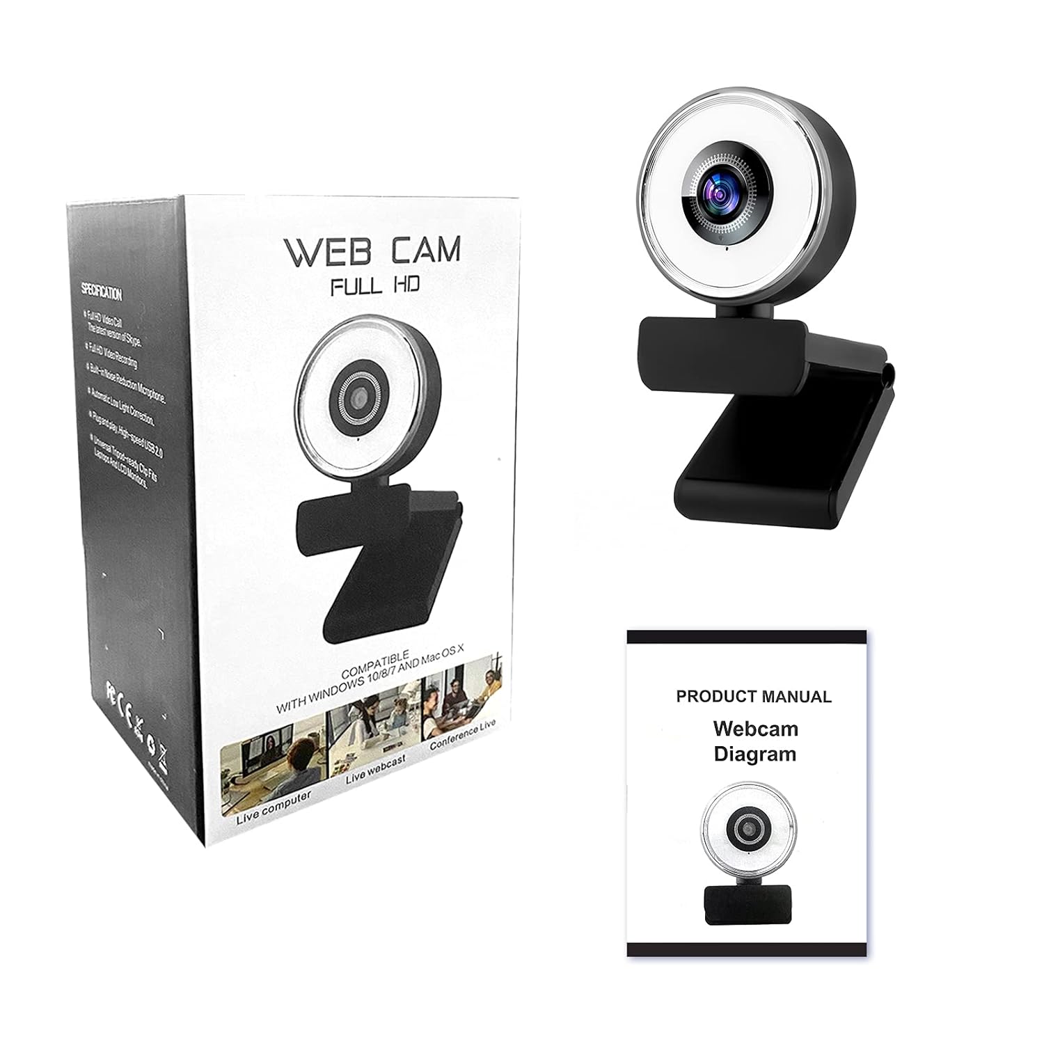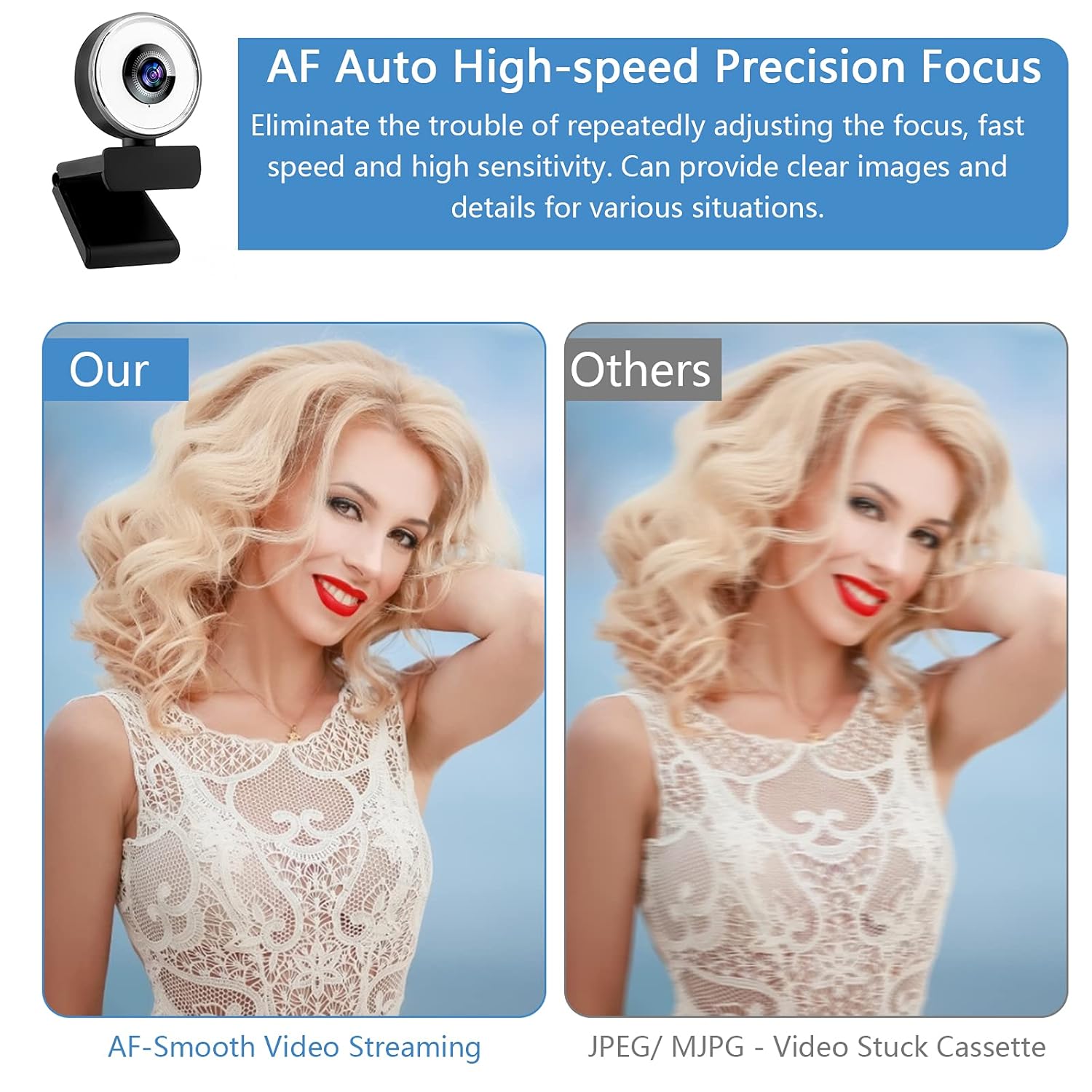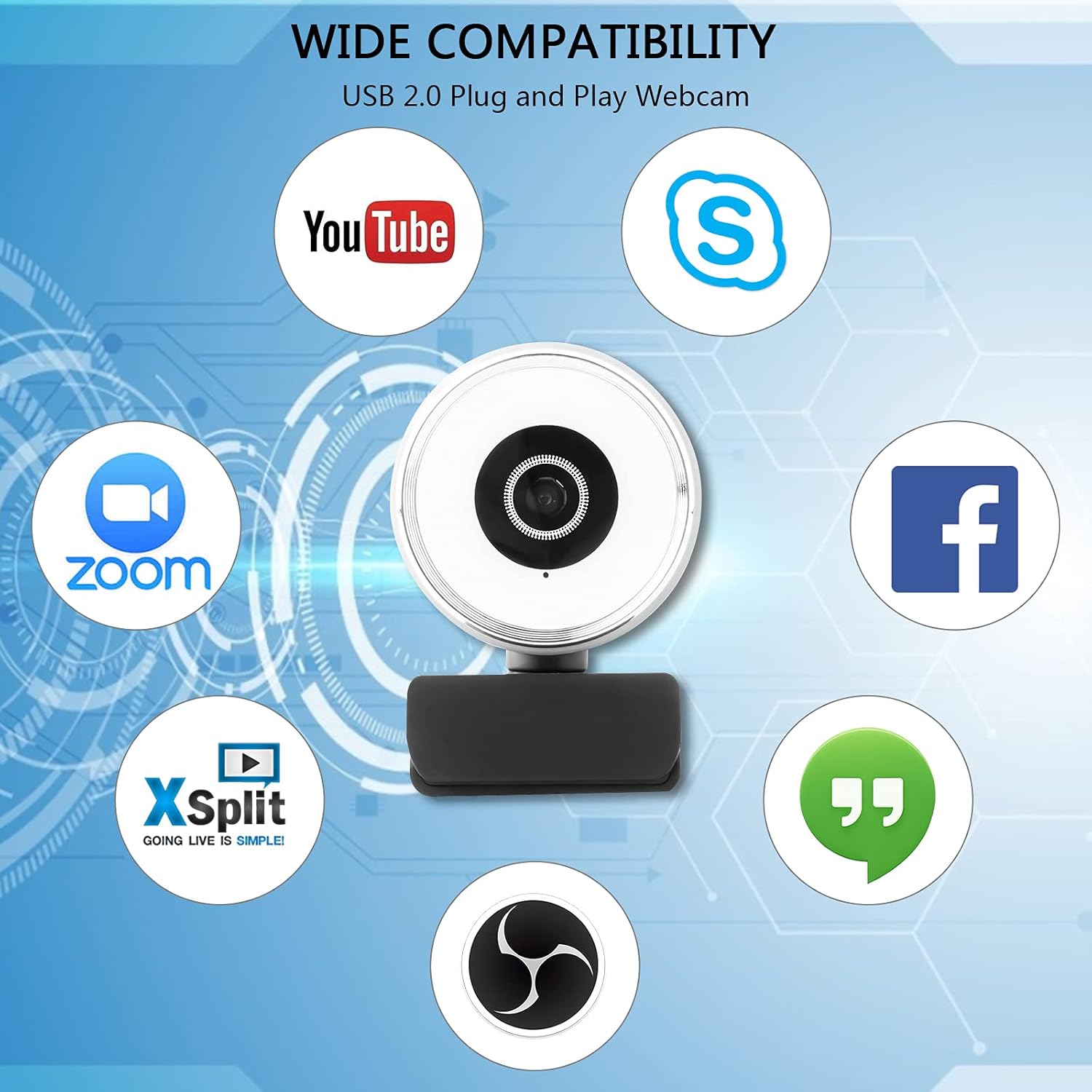 【Built-in Adjustable Ring Fill Light】full HD 1080p webcam Built-in ring light provides 3 different levels of lighting compensation with touch control. so you can achieve ideal brightness conditions in dim light environments.