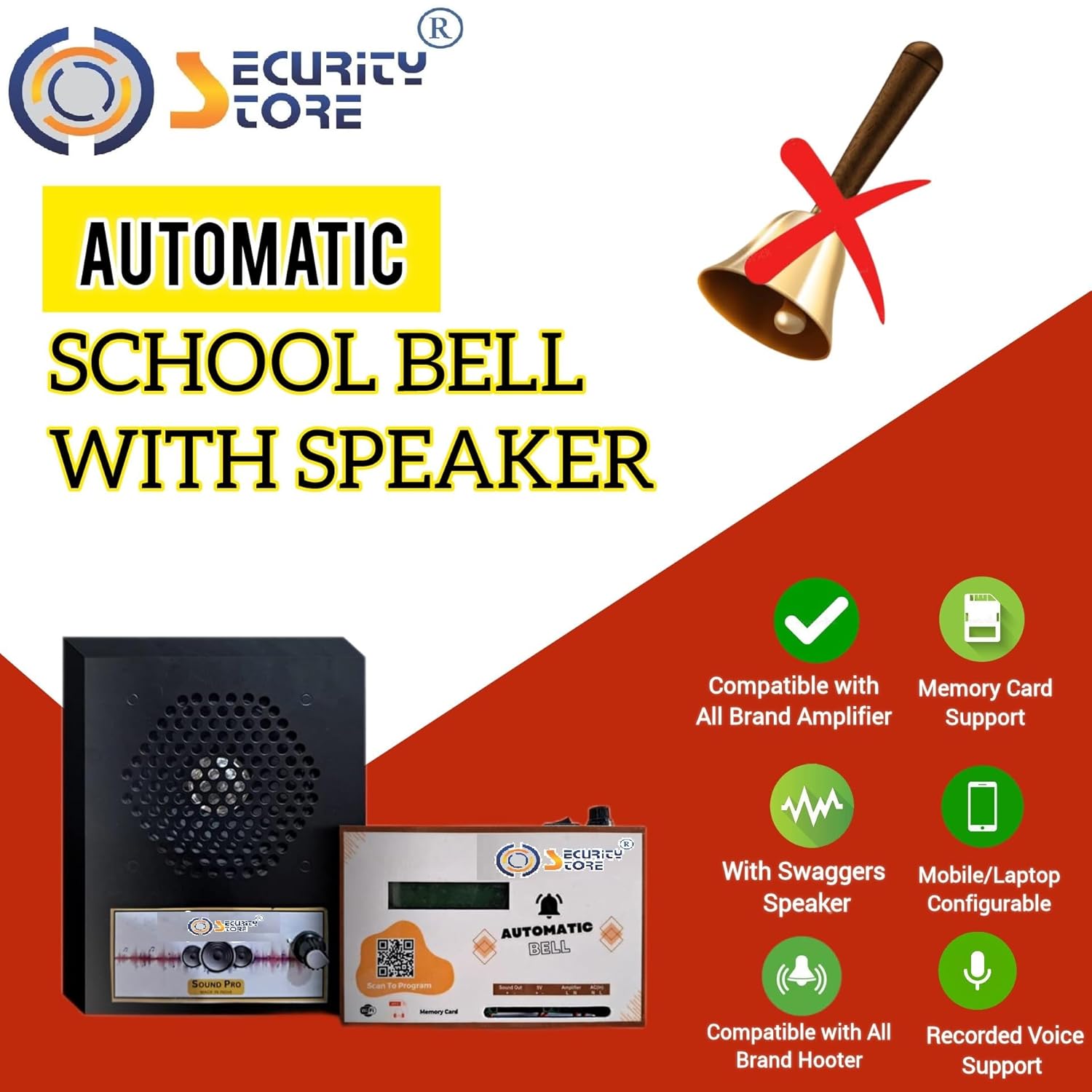 Stand-alone machine: No computers are required to program or maintain the ringing schedule. Just scan the barcode available on device with your mobile phone and your can manage the programming through your phone.