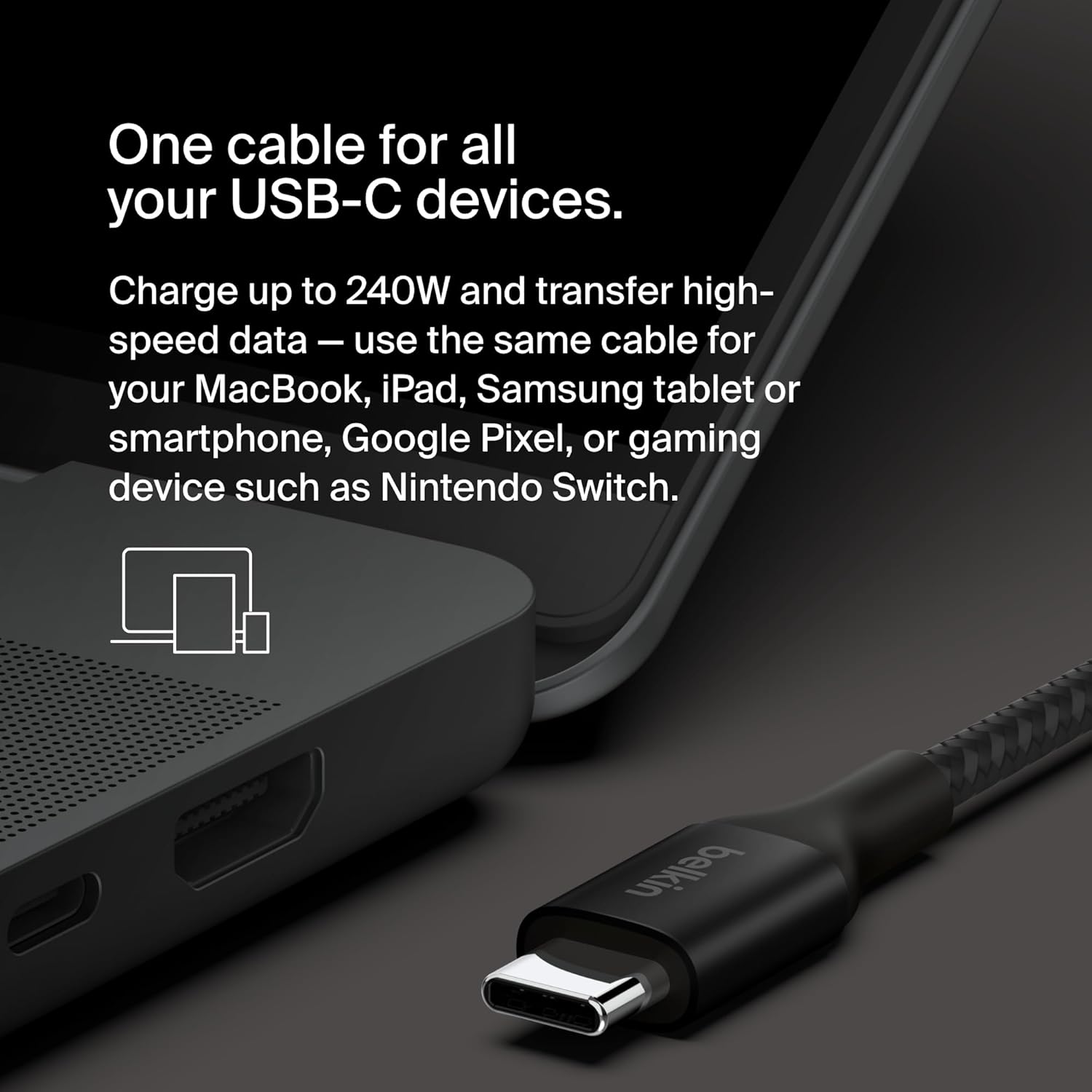 Designed for Extended Power Range (EPR) up to 240W, our USB-C to USB-C cable is compatible with the latest USB-IF guidelines on USB 2.0 and PD 3.1 devices. Charge your MacBook, Chromebook, gaming laptop, iPad and other high-powered USB-C devices with a durable cable that delivers safe and optimal charging speeds.