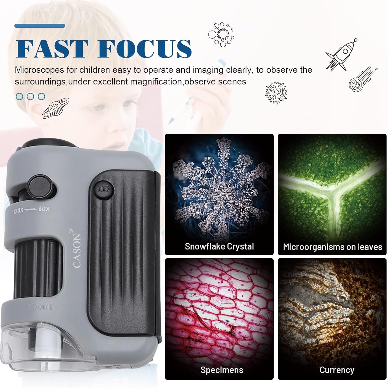 High Magnification- With a versatile magnification range of 60x to 120x, you can clearly see individual cells. A powerful magnification range can meet the needs of daily use. The microscope for kids focuses easily, which can see the beauty of nature that the naked eye can’t see.