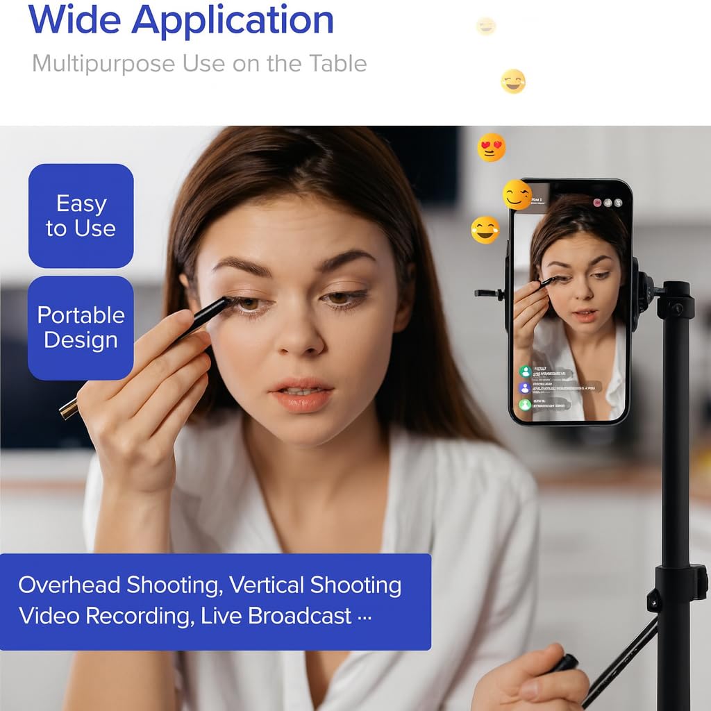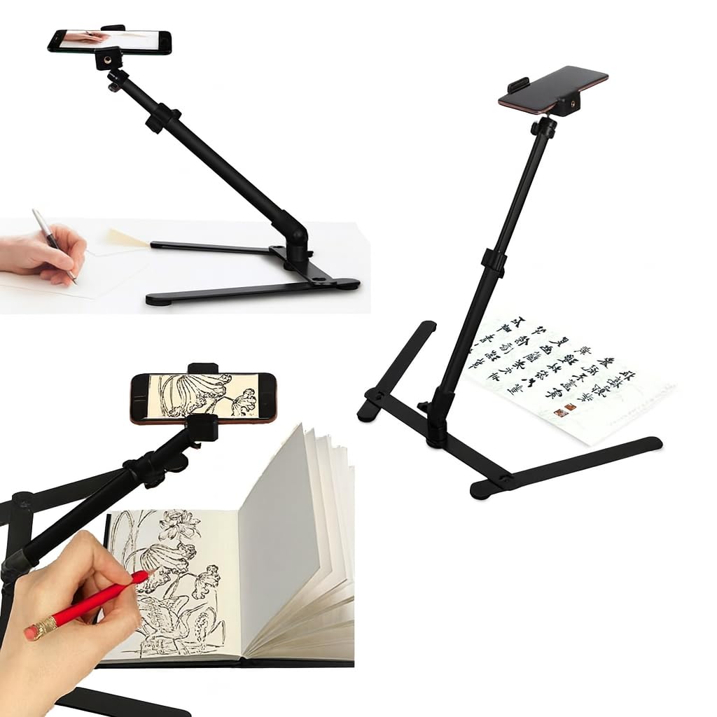 Upgrade your filming and presentation setup with this Overhead Tripod Stand, designed for mini projectors, smartphones, cameras, and webcams. Whether you’re decorating cookies, live streaming, teaching online, or showcasing products, this adjustable tabletop tripod provides the stability, flexibility, and height control you need. The 360° rotation and support for both horizontal and vertical shooting make it incredibly versatile. Move it freely across desks, countertops, or workbenches for the perfect angle every time. With an adjustable height from 10 to 17 inches (26.5cm–43cm) and a tilt range from 30° to 90°, this stand easily adapts to your workflow or creative space. Crafted with a solid aluminum alloy rod and a heavy-duty cast iron base, it delivers exceptional durability and reliable support. The telescopic clamp securely holds your device in place—compatible with smartphones, cameras, and popular mini projectors like Amoowa M1S, P07s, P150G, AAXA LED Pico, and others. Whether you’re filming overhead shots, hosting Zoom classes, or creating social media content, this overhead phone and projector stand is your perfect companion for hands-free precision, stability, and convenience.