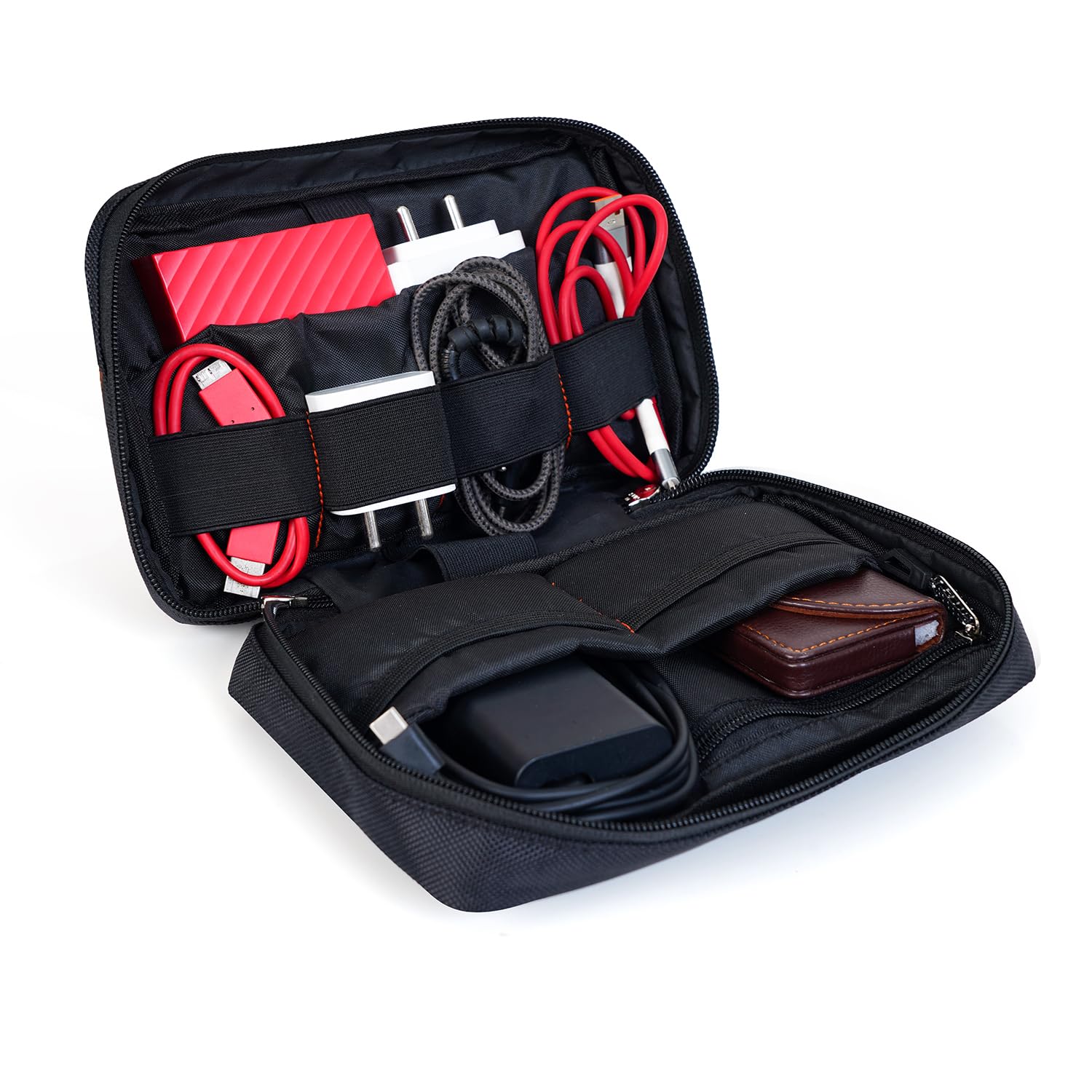 Cable Organizer Pouch: Equipped with elastic loops to keep cables untangled and neatly arranged in their own compartments.