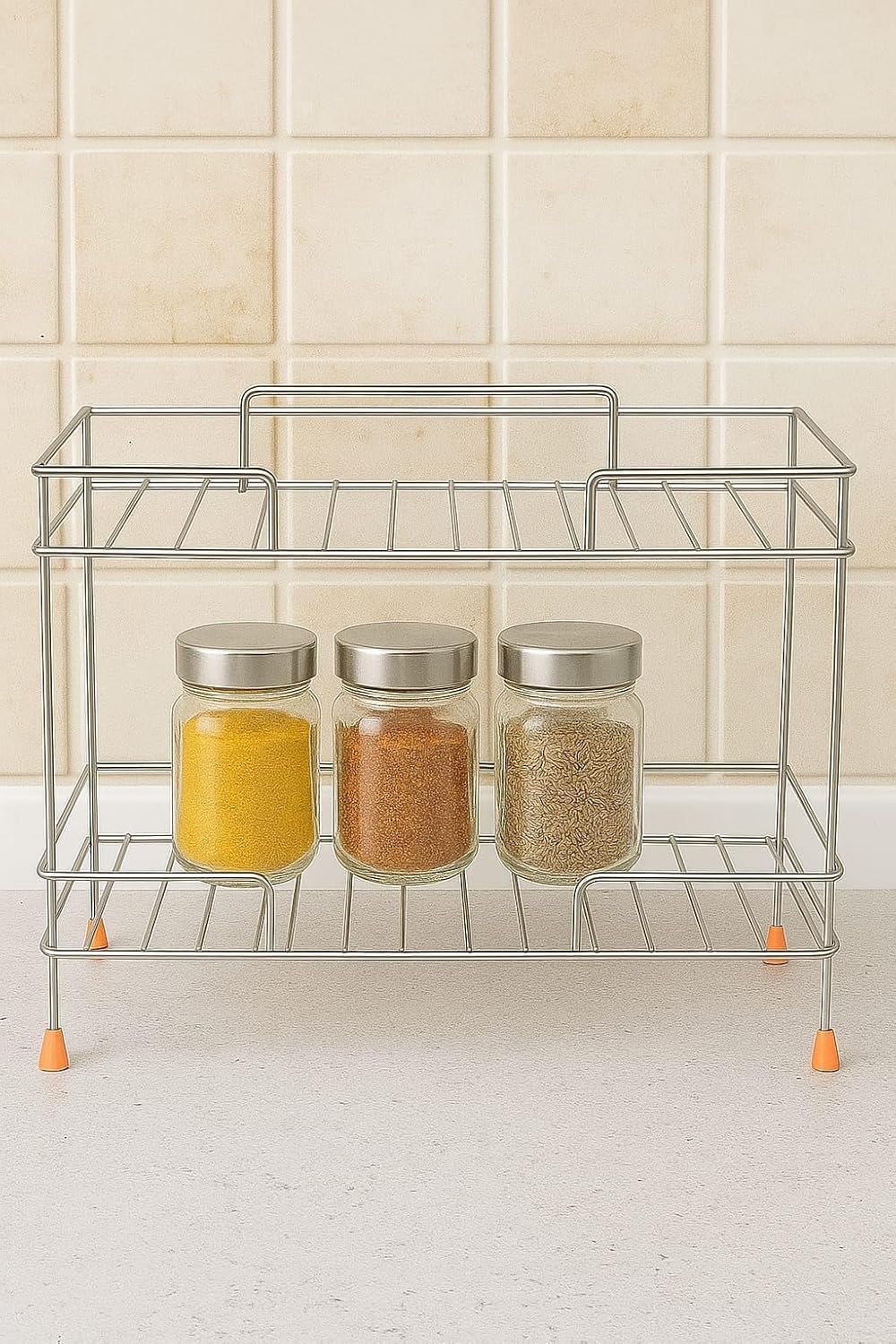 Cri8Hub 2-Tier Stainless Steel K itchen Storage Spice Rack and Cantainer Organizer Counter top Kitche n Stand Multipurpose Masala Stand for Kitche n Kitche n Space Saver Rack (Pack of 1)