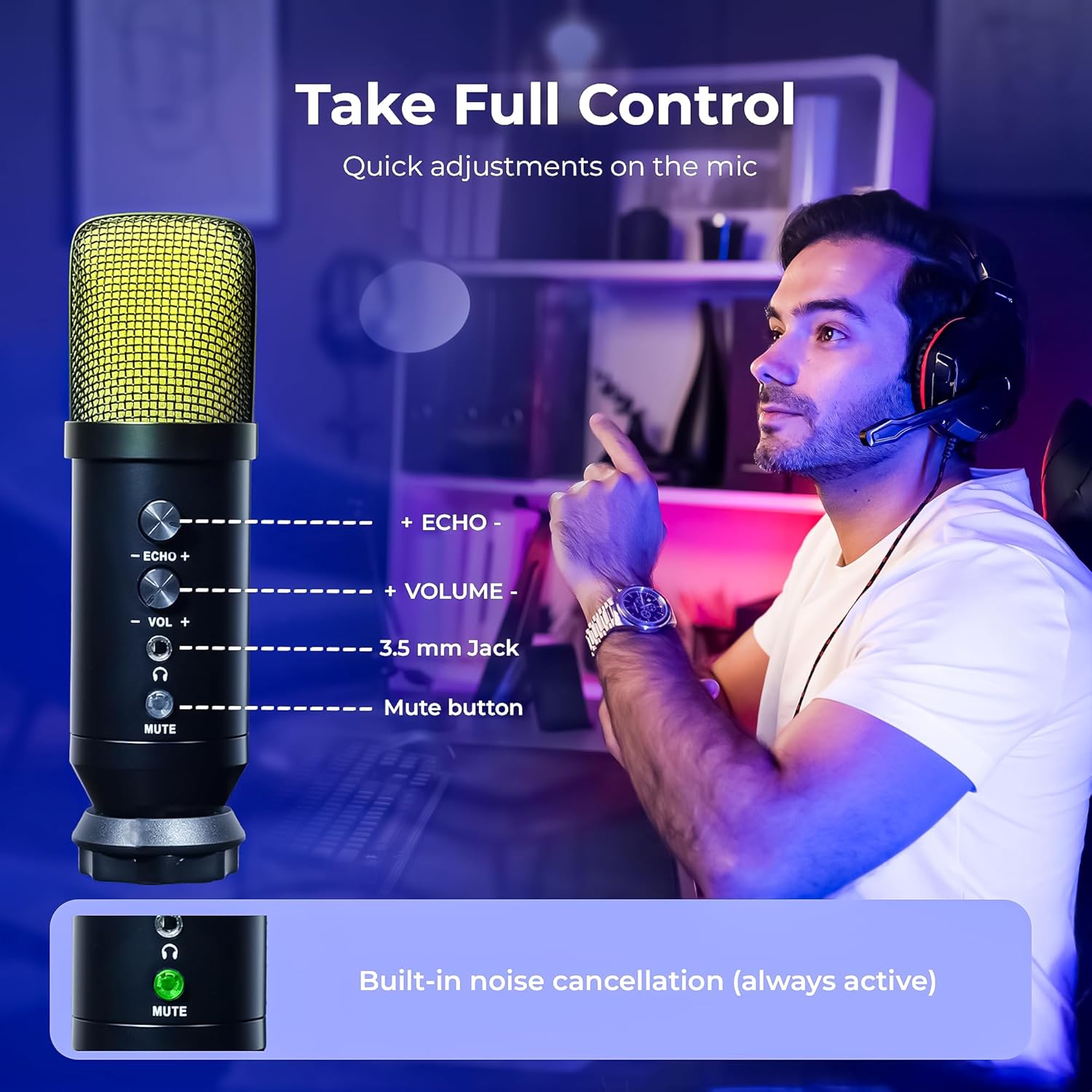 Real-Time Audio Controls – Easily adjust volume, echo, and monitoring levels with the intuitive knob system—no software or driver required.