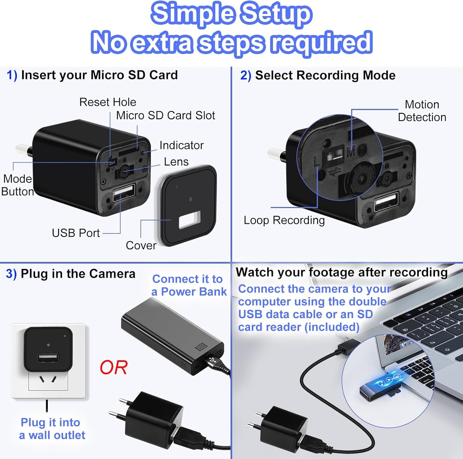✅ [Easy to use]: The plug & play surveillance camera is support FAT32 format SD card and requires no prior setting. Insert SD card, plug the device into a power socket and the video recording will begin. The recording will cease the moment the device is unplugged. The video content recorded on the SD card can be viewed by connecting the USB device to a computer/ with OTG connector to Mobile.