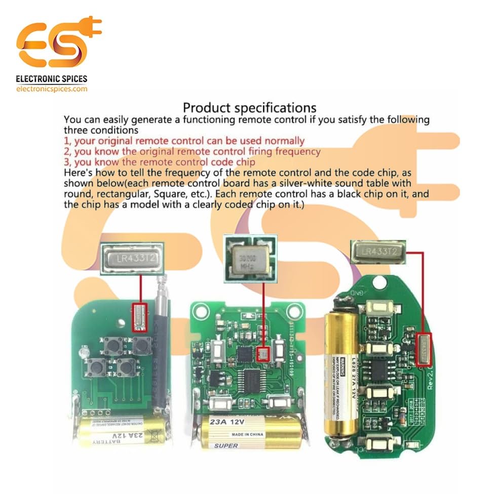 Frequency: 433 MHz | Channel: 4 Channel (4CH) | Encoding Chip: EV1527 learning code | Power Supply: DC 12V (A23 battery).