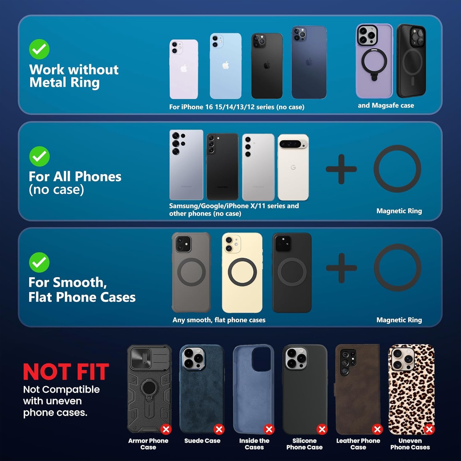 Universal Compatibility with Magnetic Ring: Works with all smartphones, including non-magnetic devices, thanks to the included magnetic ring that ensures a secure grip for mobile stand for car dashboard. Powerful Magnetic Hold: Designed with strong magnetic technology, the mount securely holds your phone even on bumpy roads, ensuring it stays in place during driving or workouts.
