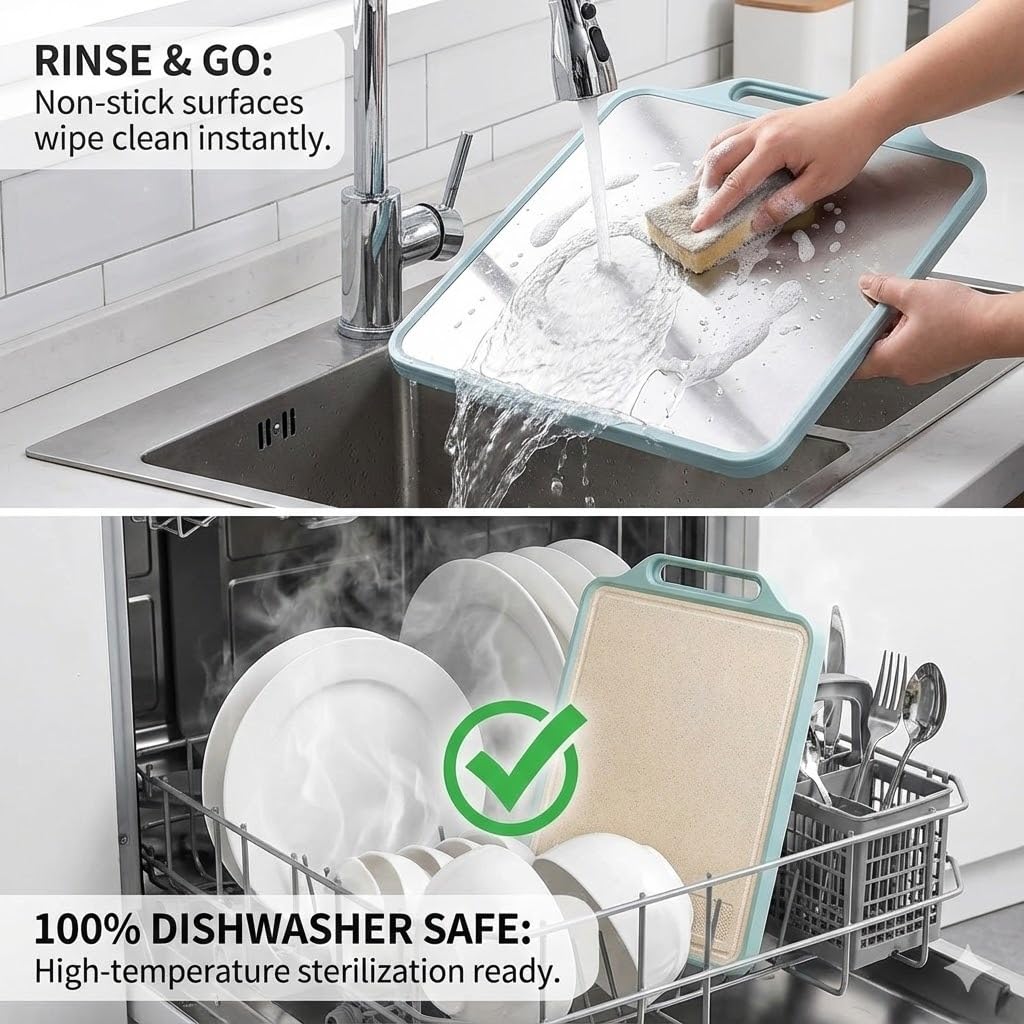 Food-Grade Safe & Non-Toxic : Both surfaces are made with food-grade materials – BPA-free wheat straw and rust-resistant steel – safe for all kitchen use.