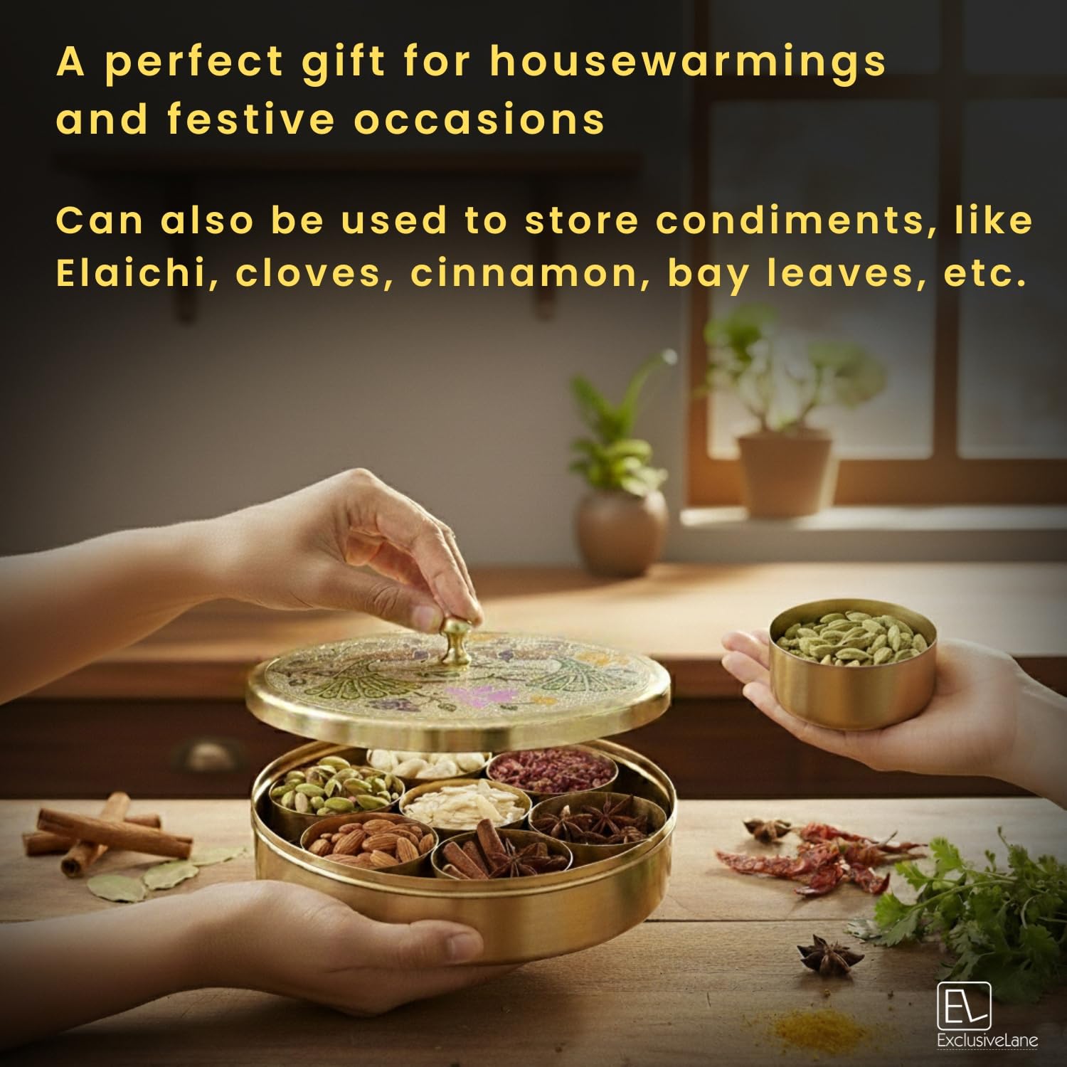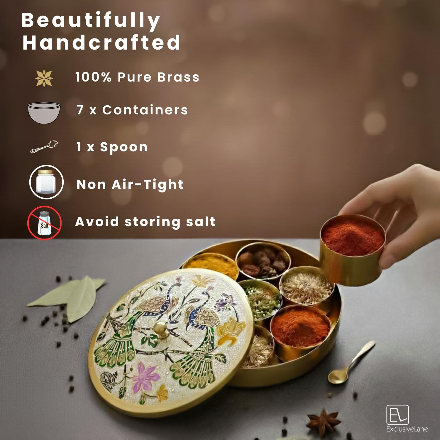 PACKAGE CONTENT: 1 Spice Box, 7 Containers, 1 Spoon, COLOR: Golden, MATERIAL: Brass.