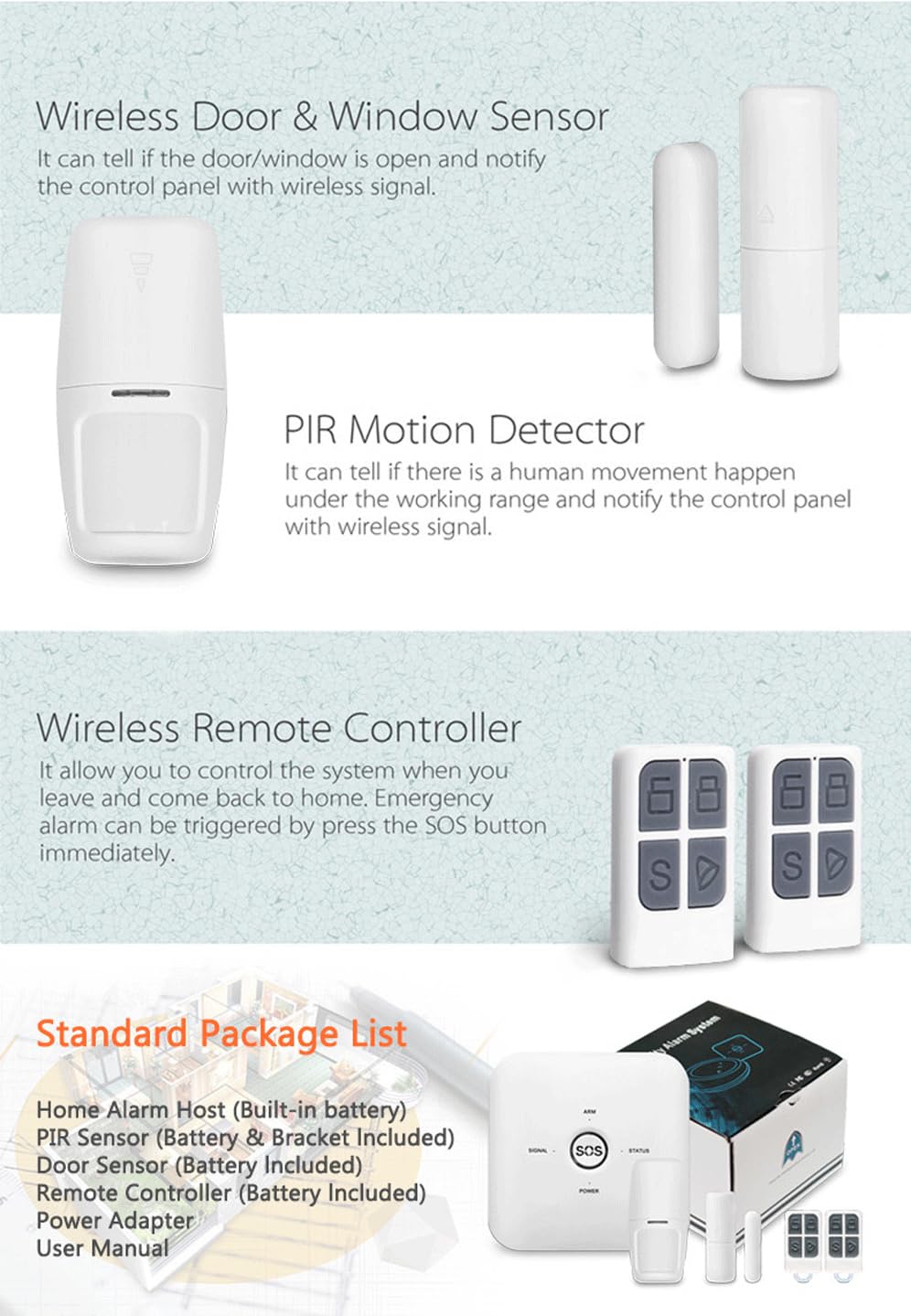 【EASY INSTALLATION】: Simplify the installation process with the DIY-friendly design of the system. Included accessories such as the PIR Detector, Door Magnetic Sensors, and Remote Control Keyfobs make setup hassle-free. This user-centric approach empowers homeowners to take charge of their security without the need for professional installation.