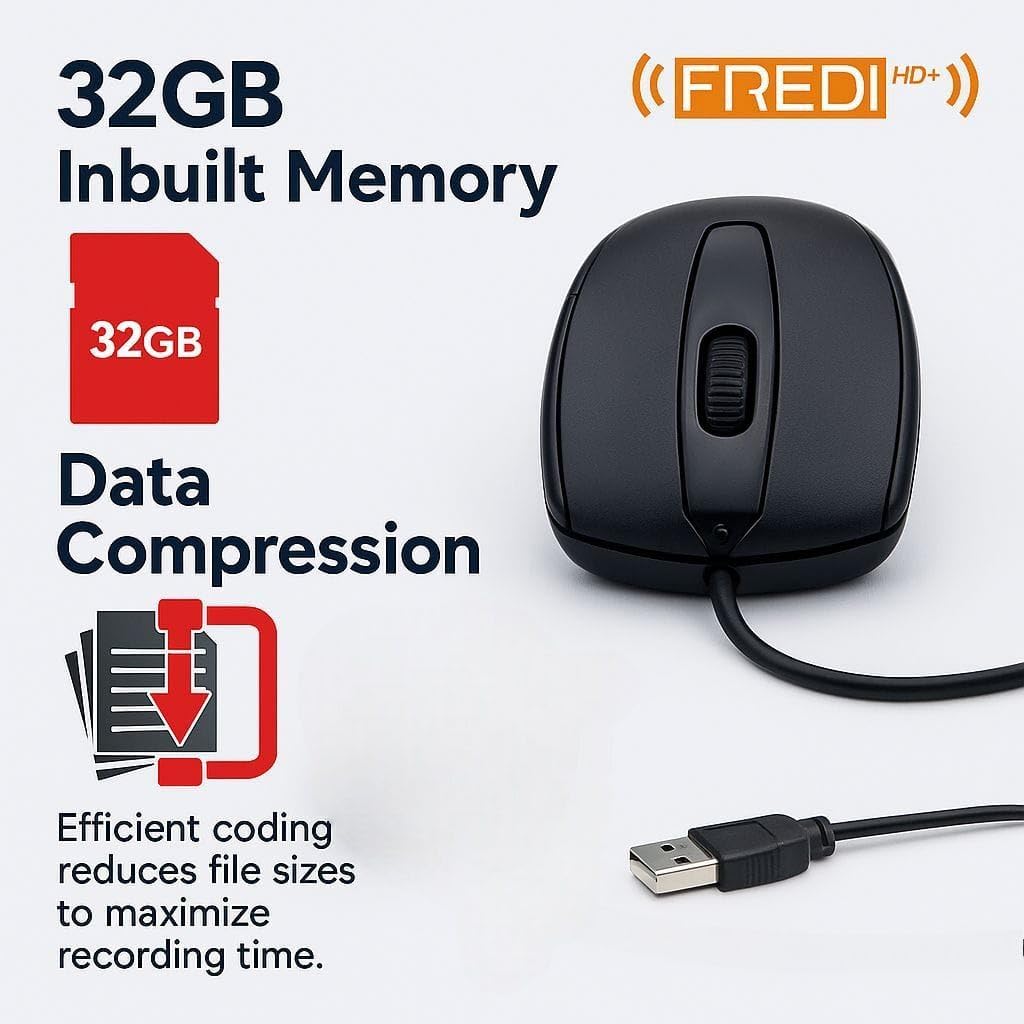 The FREDI HD PLUS USB Mouse Camera is a sleek and compact monitoring device designed to look like an everyday wired mouse while delivering high-quality performance. It’s ideal for home, office, or workspace use, offering crystal-clear 1080p Full HD video and easy playback options. With 32 GB inbuilt storage, it records for hours without needing an external memory card. The loop recording feature automatically replaces older files with new footage, ensuring continuous operation without interruptions. You can easily access and play recordings on your mobile or computer using the iWFCAM application or by connecting the device via USB. Thanks to smart data compression, more videos are saved efficiently without losing quality. This device works on a simple Plug & Play USB design, requiring no charging or battery — just connect it to a USB port and it starts working instantly. Discreet, durable, and functional, the FREDI HD PLUS Mouse Camera offers a perfect blend of utility and technology for everyday indoor use.