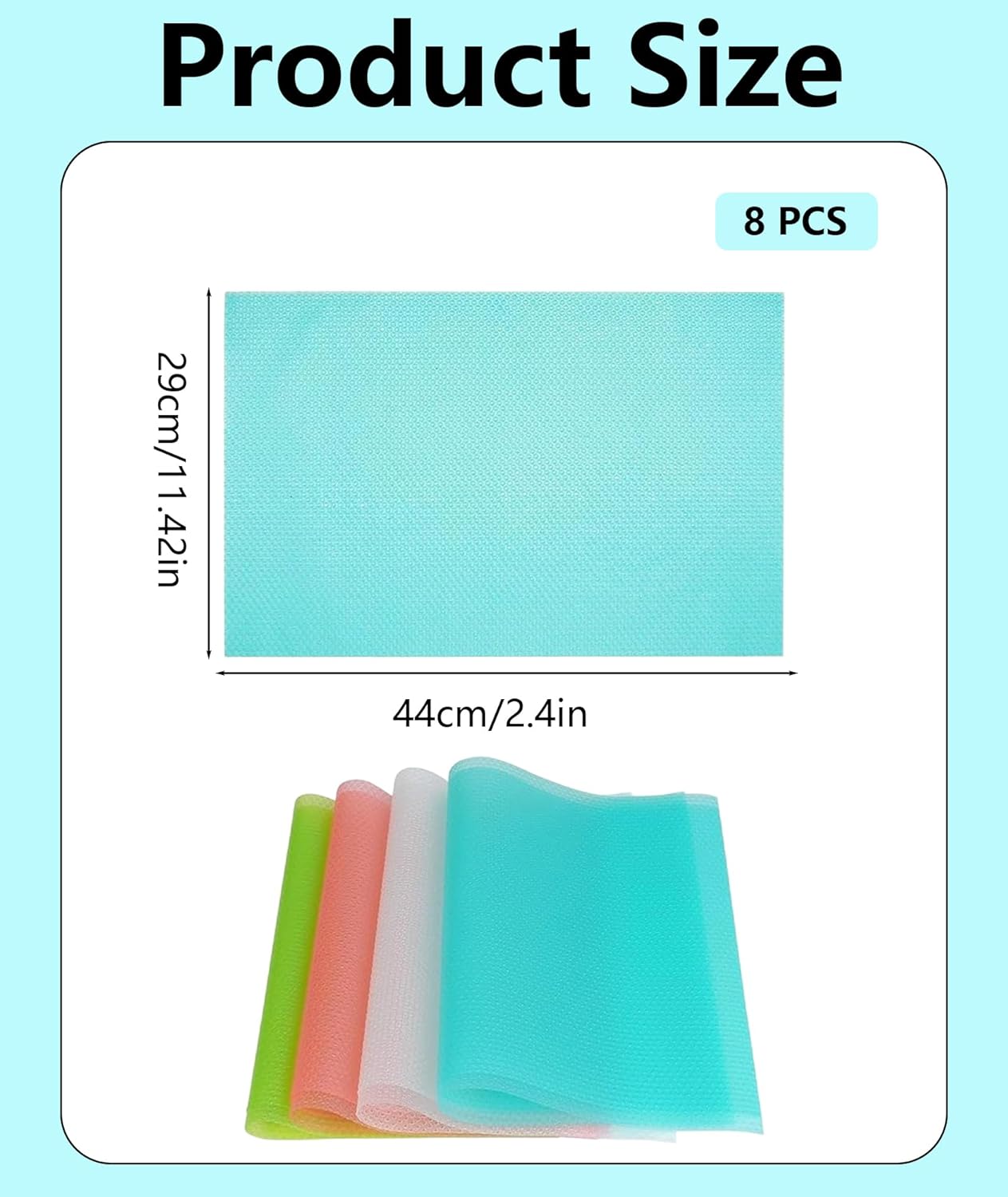 Fridge Mats Set of 8: Includes eight durable fridge mats designed to fit most refrigerator drawers; The non-slip surface keeps fruits and vegetables in place while preventing cross-contamination; Ideal for maintaining a clean and organized fridge