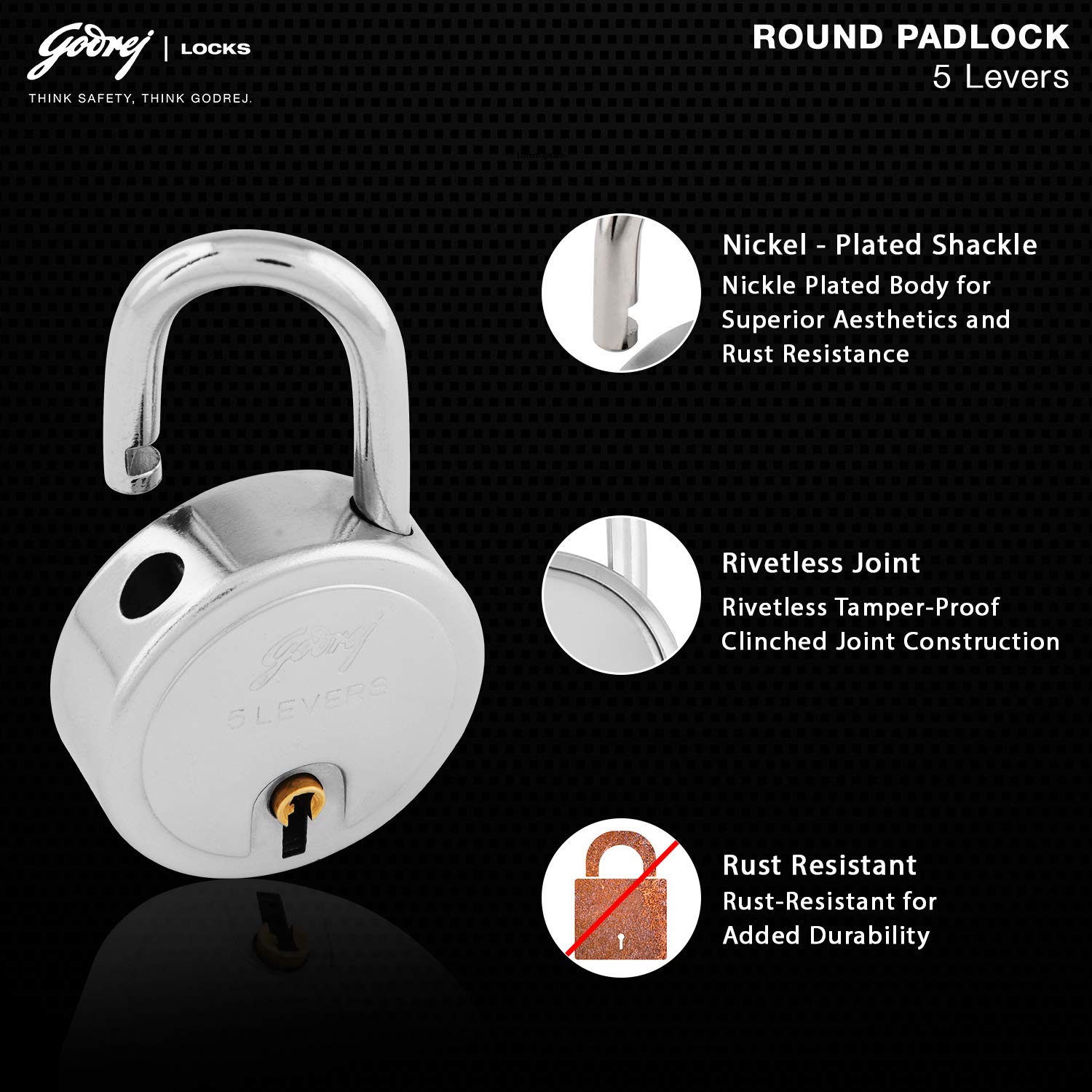 Application: For indoor and outdoor use. Godrej Round Padlock is best used for luggage, doors, shutters, storage box, trunks, lockers.