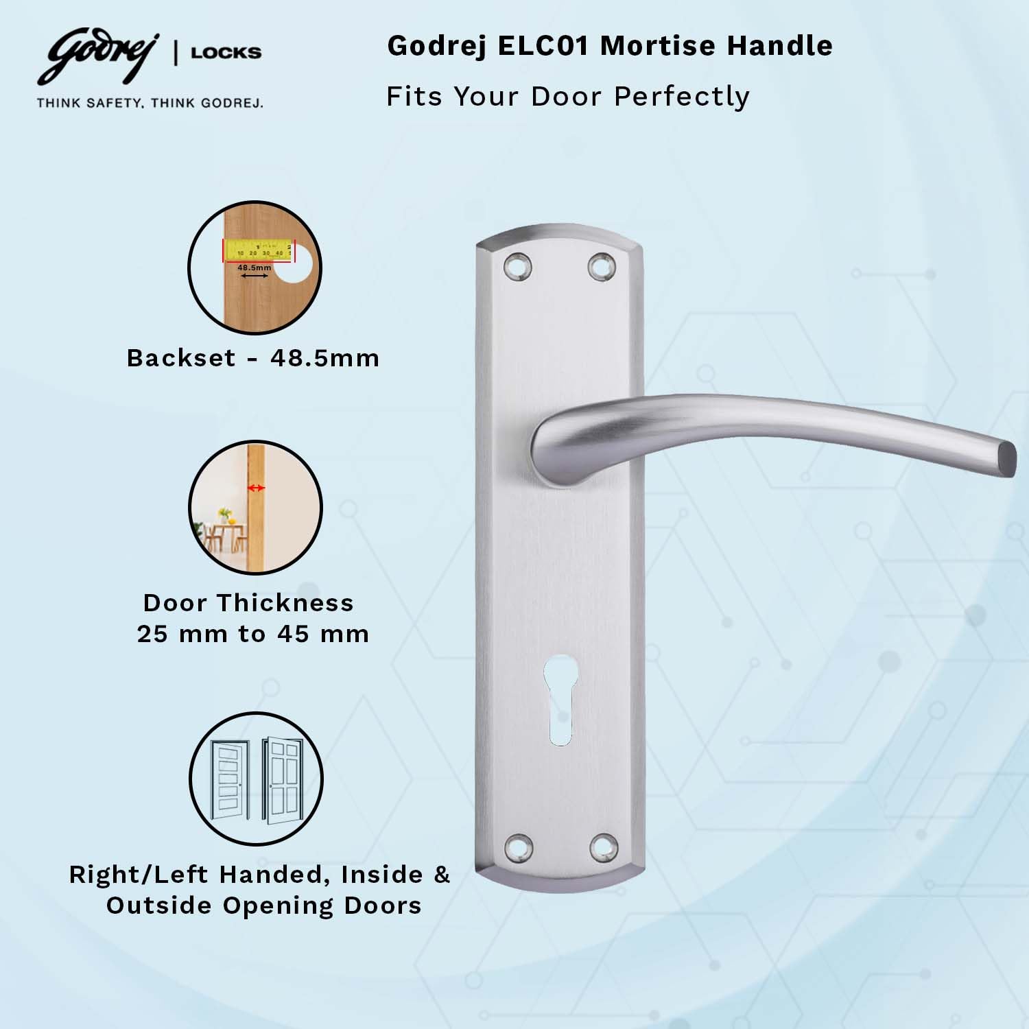Godrej Mortise Door Lock | ELC 01-6 Levers | Handle Set with 2 Keys | Suitable for Left & Right Handed, Inside & Outside Opening Door Handle Set | Satin Steel Finish | Silver | 5 Years Warranty