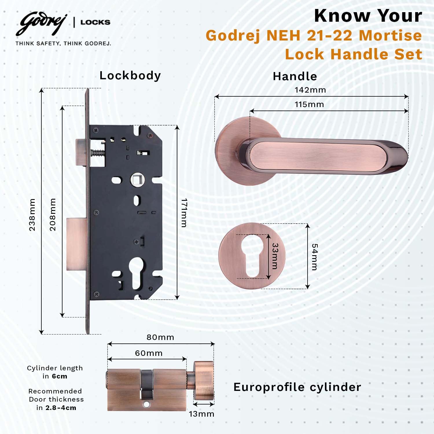 Enhance the beauty and security of your door with this elegantly designed handle set. Crafted with precision, it seamlessly blends style and functionality, offering a sturdy lock body and cylinder that provide both exceptional security and a touch of luxury. Made from high-quality zinc-based die-cast alloy, this handle set ensures long-lasting durability and flawless performance. The black antique copper finish adds a sophisticated touch, while the electroplated forend and striker plates give it a polished, enduring appearance. The handle set is designed to be versatile, featuring a reversible latch bolt that can be easily adjusted to fit different door openings, allowing for convenient access from either side. The double-throw deadbolt adds an extra layer of security, making this handle set an ideal choice for various applications. The 60mm 1CK Eco Pin Cylinder, equipped with a 5-pin brass tumbler mechanism, is corrosion-resistant, ensuring smooth and reliable operation over time. This handle set is suitable for both left and right-hand side openings, designed specifically for single wooden doors with a thickness ranging from 28 to 40 mm and a backset of 50 mm. Whether for main entrances or any other door in residential or commercial spaces, this handle set offers the perfect combination of style, functionality, and security.