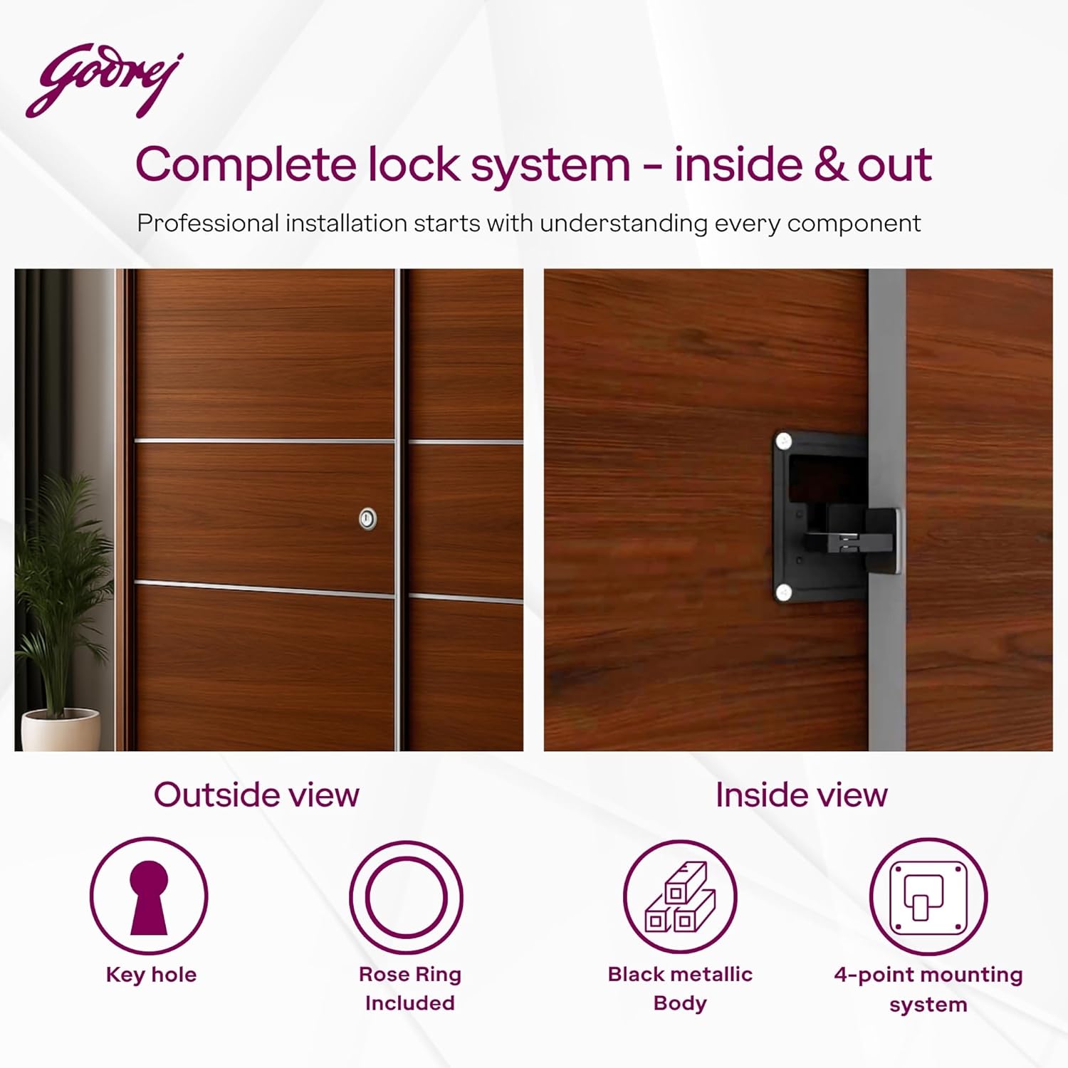 SECURE SLIDING DOOR LOCK: High-quality Godrej center wardrobe lock with dimple key featuring a single-row pin tumbler mechanism for optimum safety. 4 mounting points help stregthen the lock and High strength with broader and stronger metal bolt.