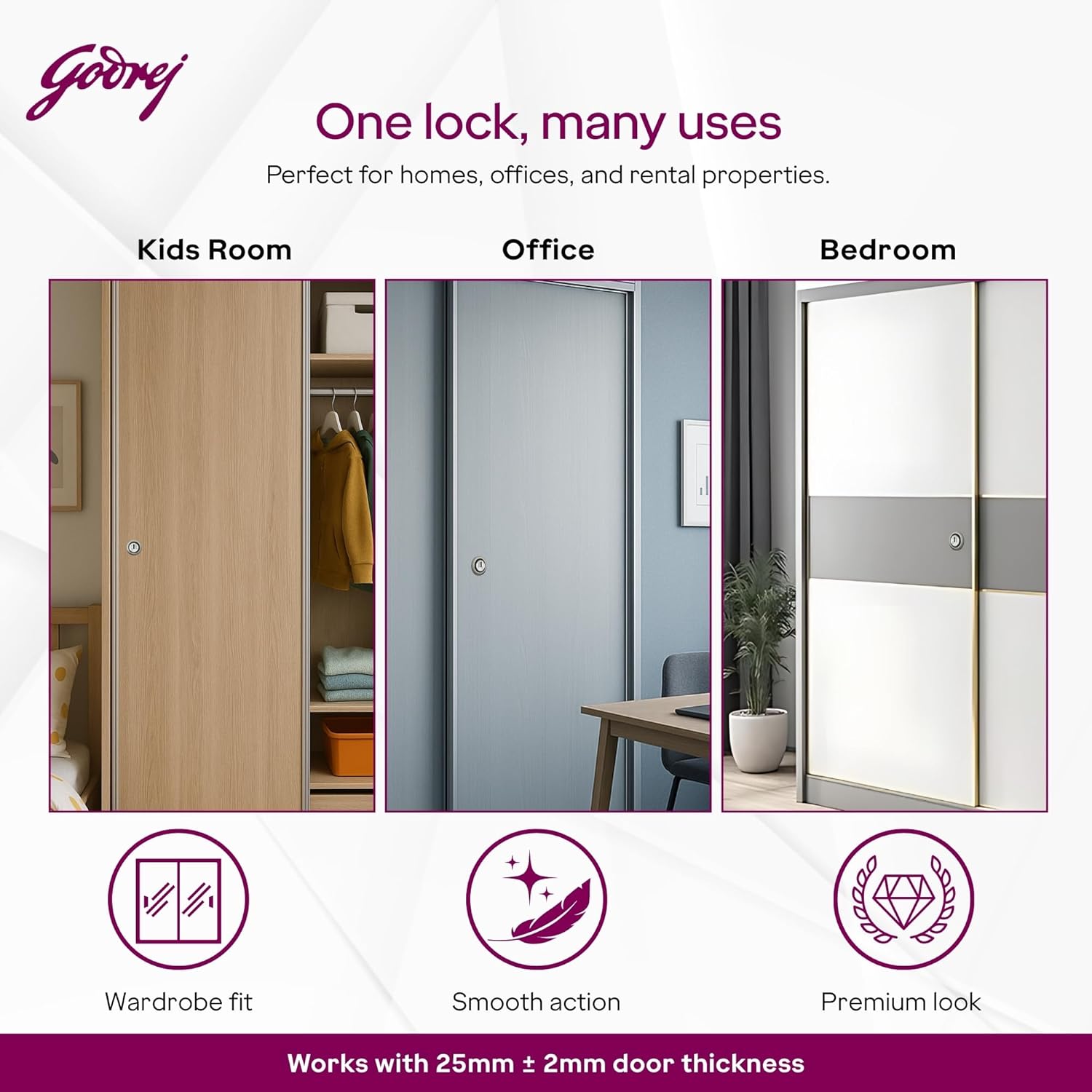 VERSATILE COMPATIBILITY: This sliding lock for wardrobe fits unobtrusively on wooden door panels with upto 25mm thickness. Suitable for both double door wardrobes only, providing a secure locking solution for sliding door applications.