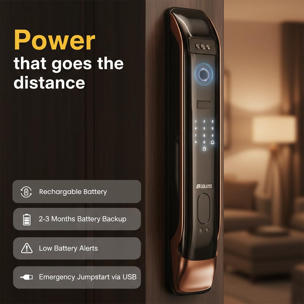 ✅ 𝐋𝐨𝐧𝐠-𝐋𝐚𝐬𝐭𝐢𝐧𝐠 𝐑𝐞𝐜𝐡𝐚𝐫𝐠𝐞𝐚𝐛𝐥𝐞 𝐁𝐚𝐭𝐭𝐞𝐫𝐲 :– Powered by a 4200mAh rechargeable battery, the lock lasts up to 2 months per charge (usage dependent). Stay worry-free with low-battery alerts and emergency power options.