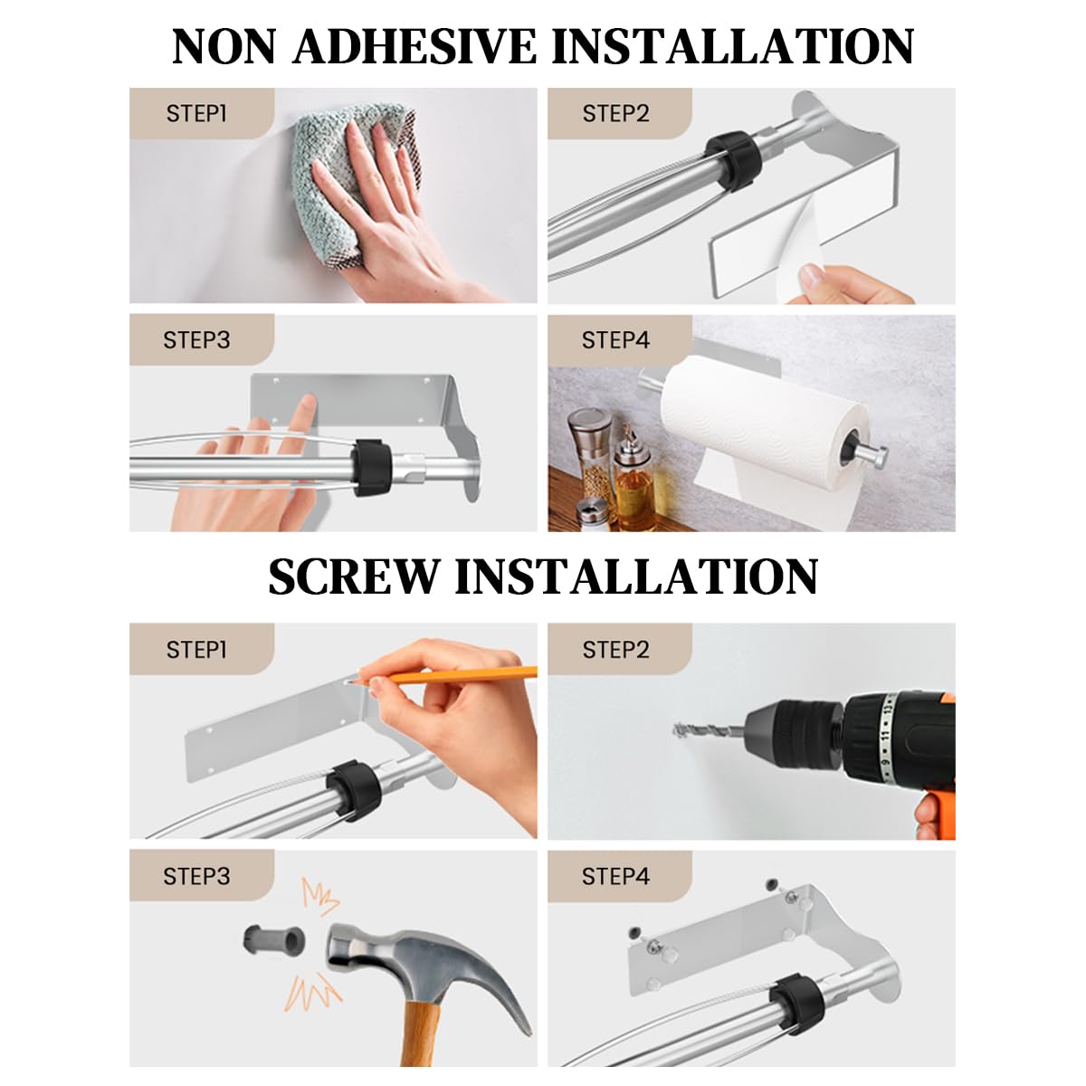 2 INSTALLATION METHODS: you can install it without drilling, self adhesive installation or hole punching installation, this paper towel holder is designed with no-drill, self-adhesive design, so you can easily install it without damaging the wall or cabinet, with a simple and practical appearance. You can also choose to install it by punching holes, complimentary mounting accessories, more solid installation.
