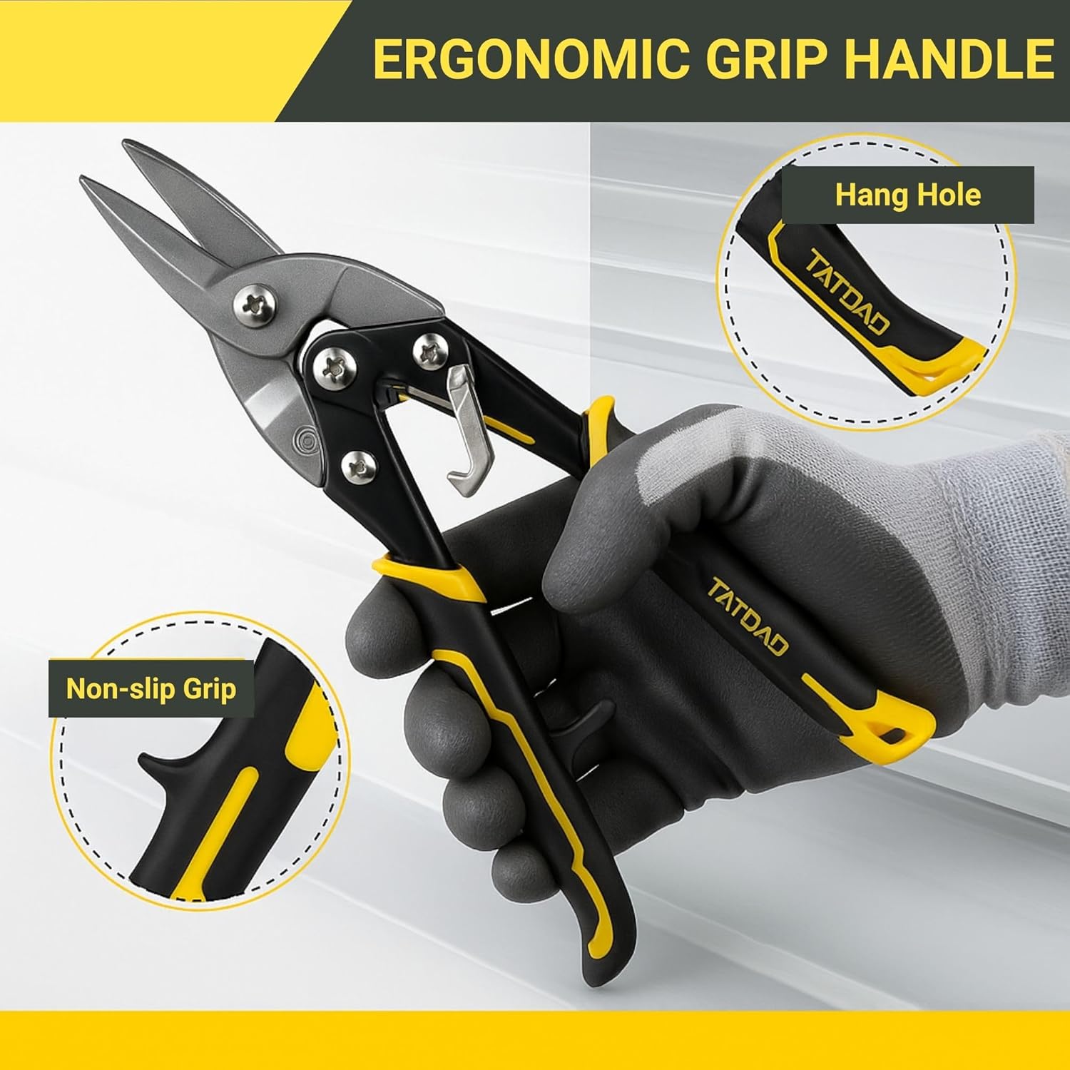COMFORTABLE GRIPS : Cuts straight and slight curves Ergonomic, single handed latch operation for left or right handed use, The tail of aviation shear is with suspension hole design, which is easy to carry and store. Made from forged alloy steel. Bi-material handle for comfort and grip