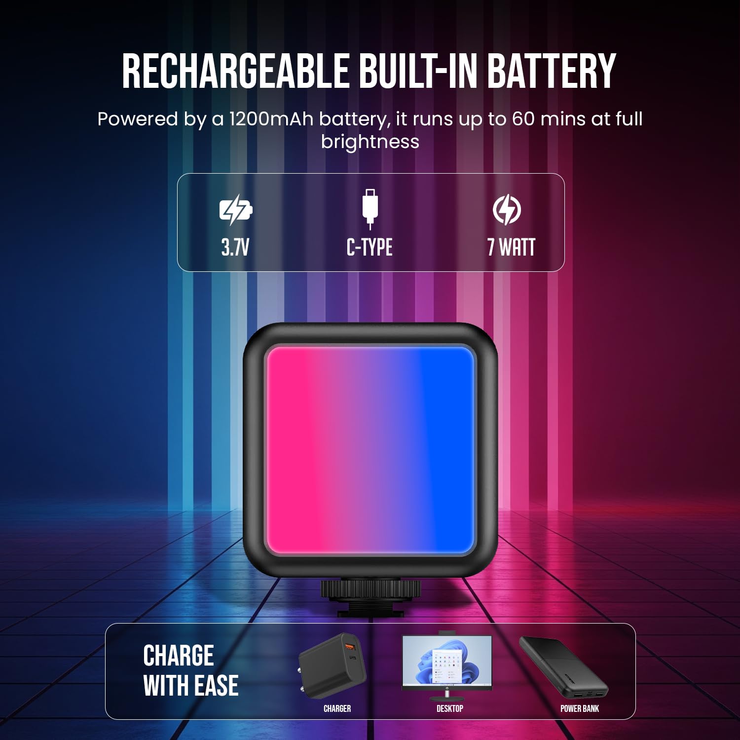 【1200mAh Large Capacity Battery】The Mini Led Lights Is Built-In 1200mah Rechargeable Battery, Charging Time Is About 1 Hours, Max Brightness Output Up to 1.5 Hours, Min Brightness Output Up to 2.5 Hours. With Type-C Charging Port On Camera Video Light, It Also Can Be Used While Charging, No Longer Need to Worry About the Problem of Insufficient Battery.
