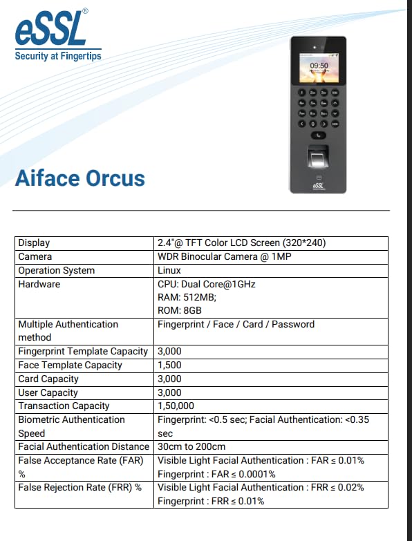Fingerprint Template Capacity : 3000, Face Template Capacity : 1500, Card Capacity : 3000, User Capacity : 3000, Transaction Capacity : 1,50,000