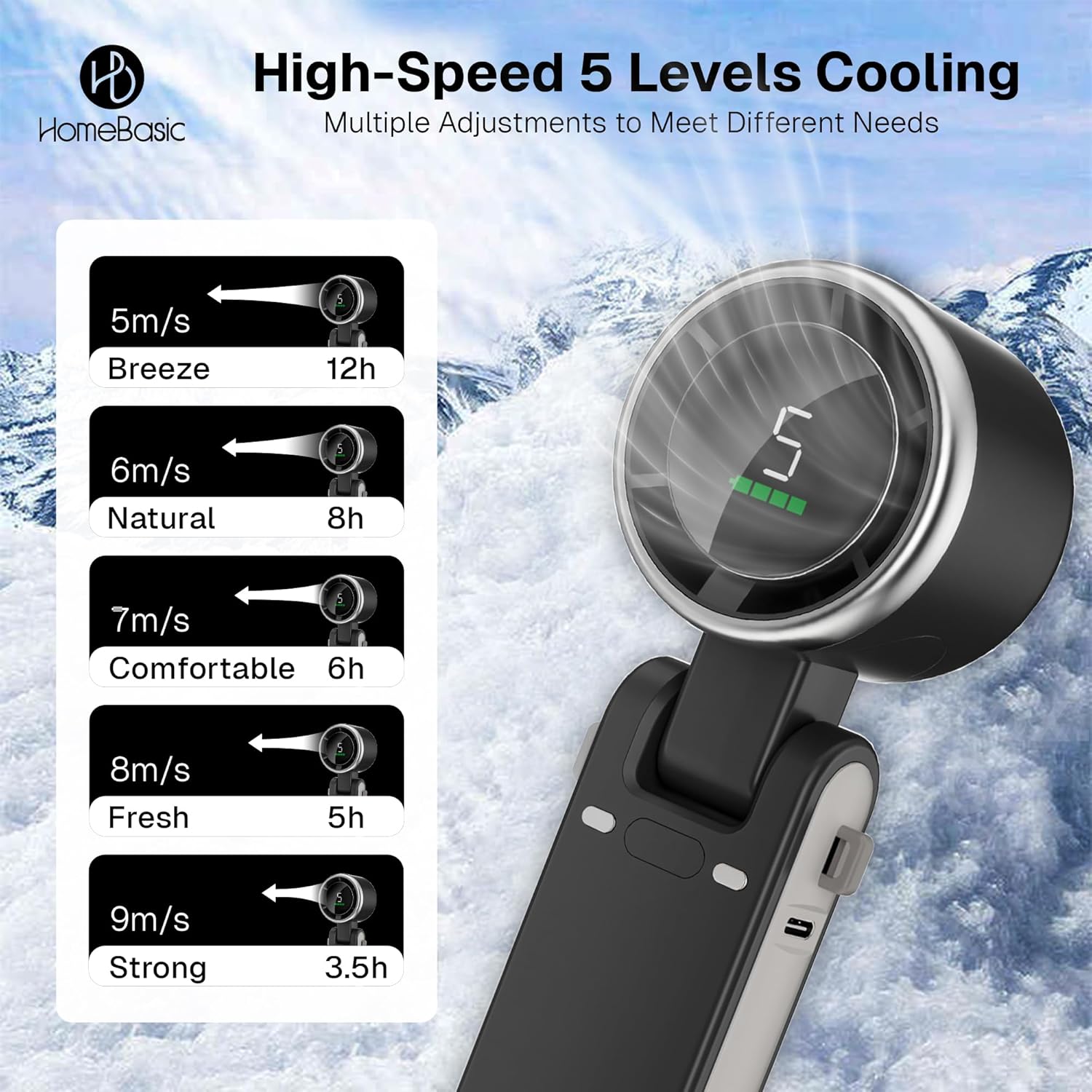 HOMEBASIC Mini Portable Fan, Hanging Neck Fan, 5-Speeds, 13000RPM, Handheld Fan with Digital Display, Rechargeable 4000mAh Battery, Foldable Pocket Fan for Travel, Office, Outdoor, Women (Turbo Frost)