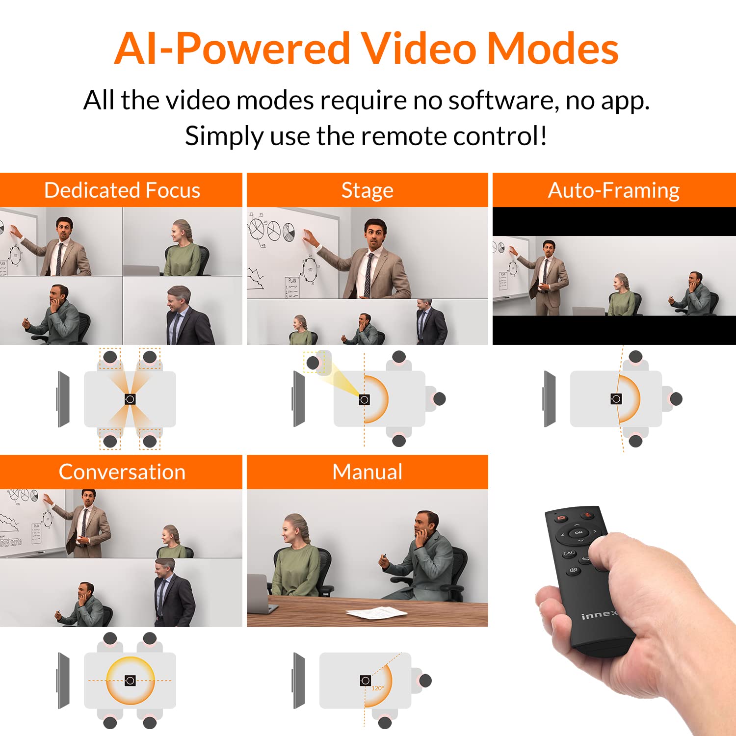 【Effortless Setup】Simply place Innex Cube 4K webcam at the center of your table, plug in via USB—no software needed. With the built-in AI and the intuitive remote control, easily adjust modes and viewing angles. Compatible with Zoom, Microsoft Teams and more for seamless integration into your workflow.
