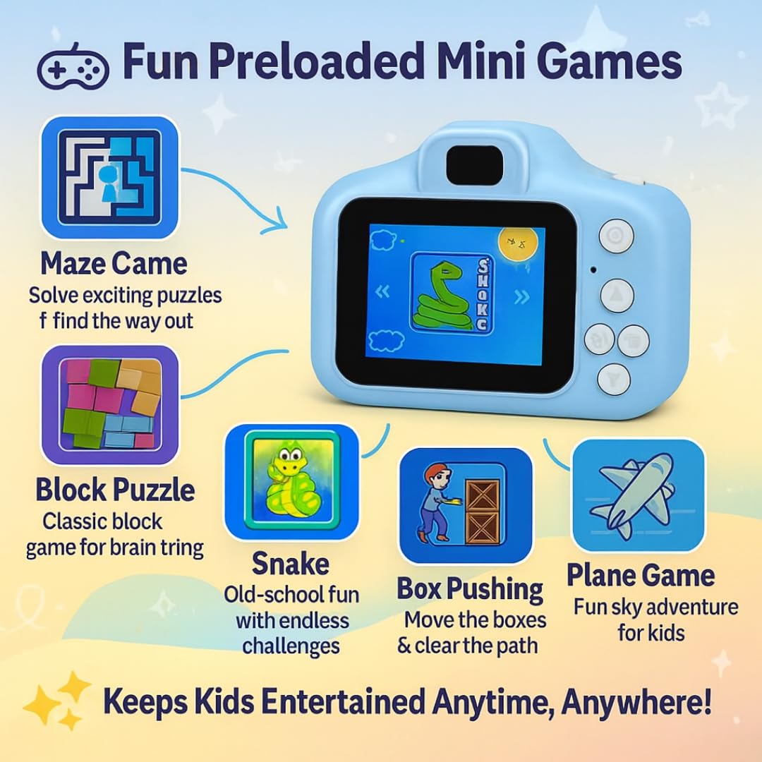 Make photo time extra fun! This kids digital camera comes with 28 cute and colorful photo frames, allowing children to personalize every picture. Encourage creativity, imagination, and endless fun — perfect for kids of all age groups!