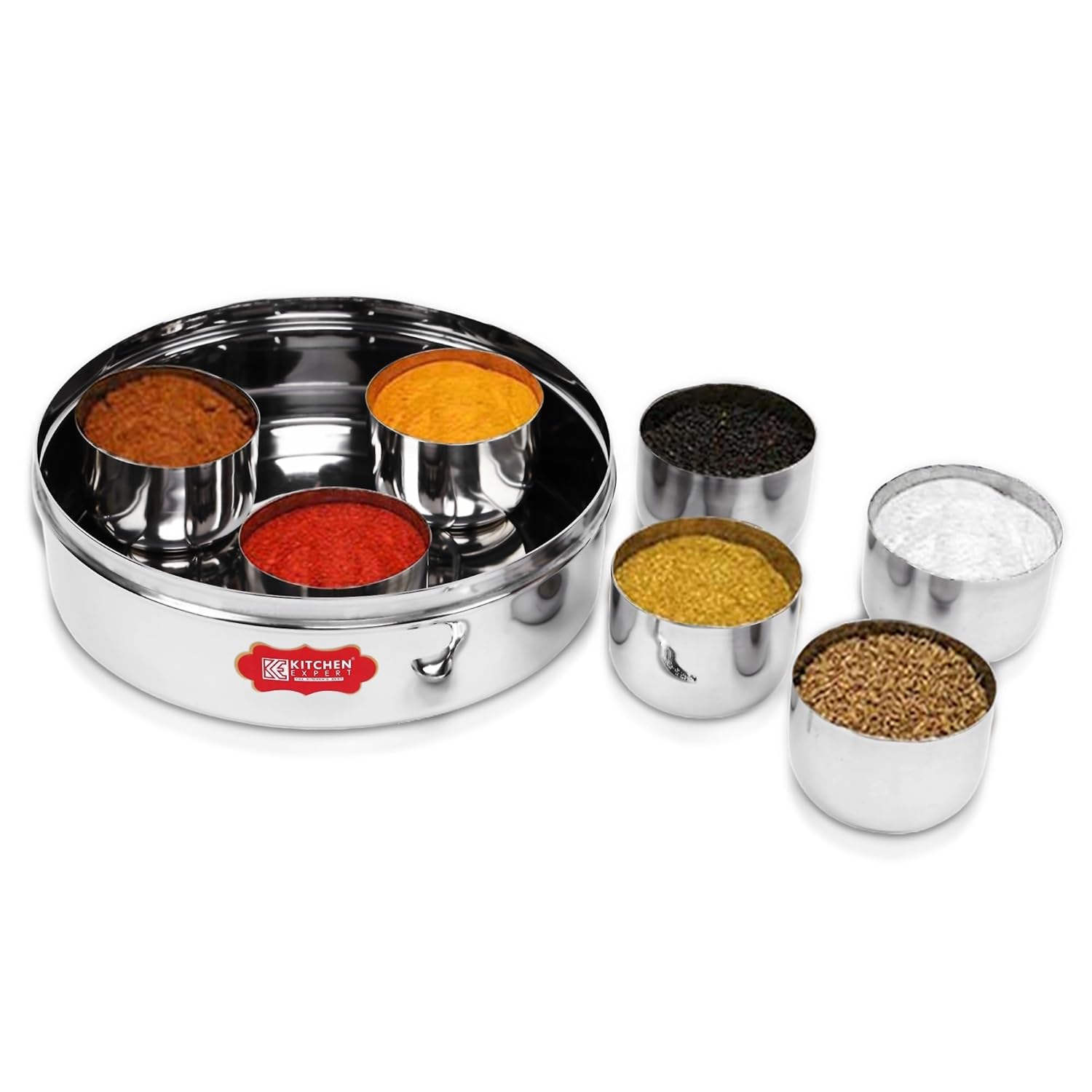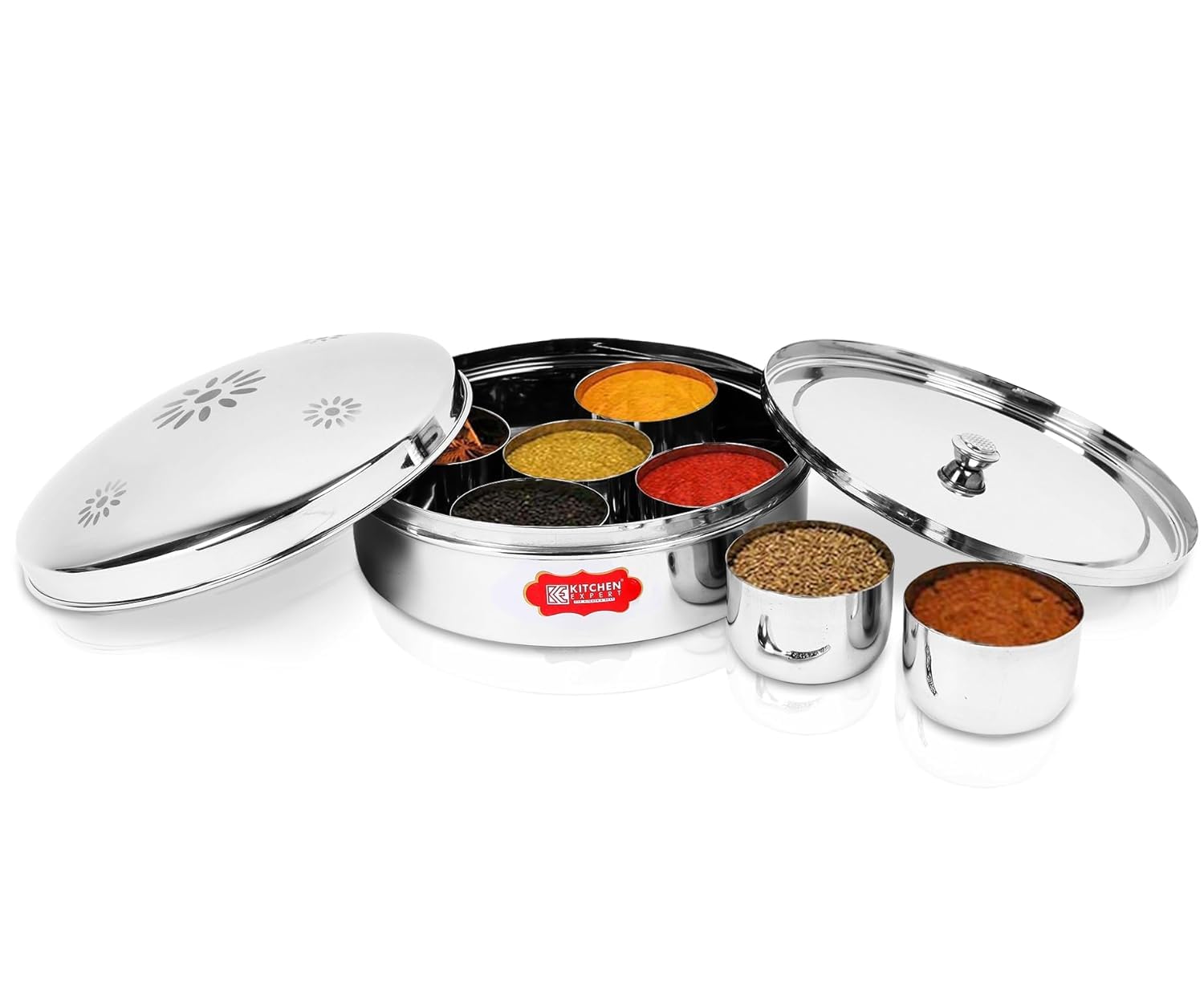 Kitchen Expert Stainless Steel Masala Box a must-have spice box organiser for every home. This masala dabba/dani comes with 7 small containers/jars and spoons for easy storage of turmeric, chili, cumin, coriander, and other spices. Made from premium stainless steel, this durable spice container features an airtight see-through lid that locks in freshness while letting you identify contents instantly. More than a masala storage set, it also works as a kitchen organiser for tea, coffee, dry fruits, or snacks. Unlike plastic boxes, this steel masala container is eco-friendly, sturdy, and stylish. An essential Indian masala box for modern kitchens, this masala jar set adds both convenience and elegance – a perfect choice for everyday use or gifting.