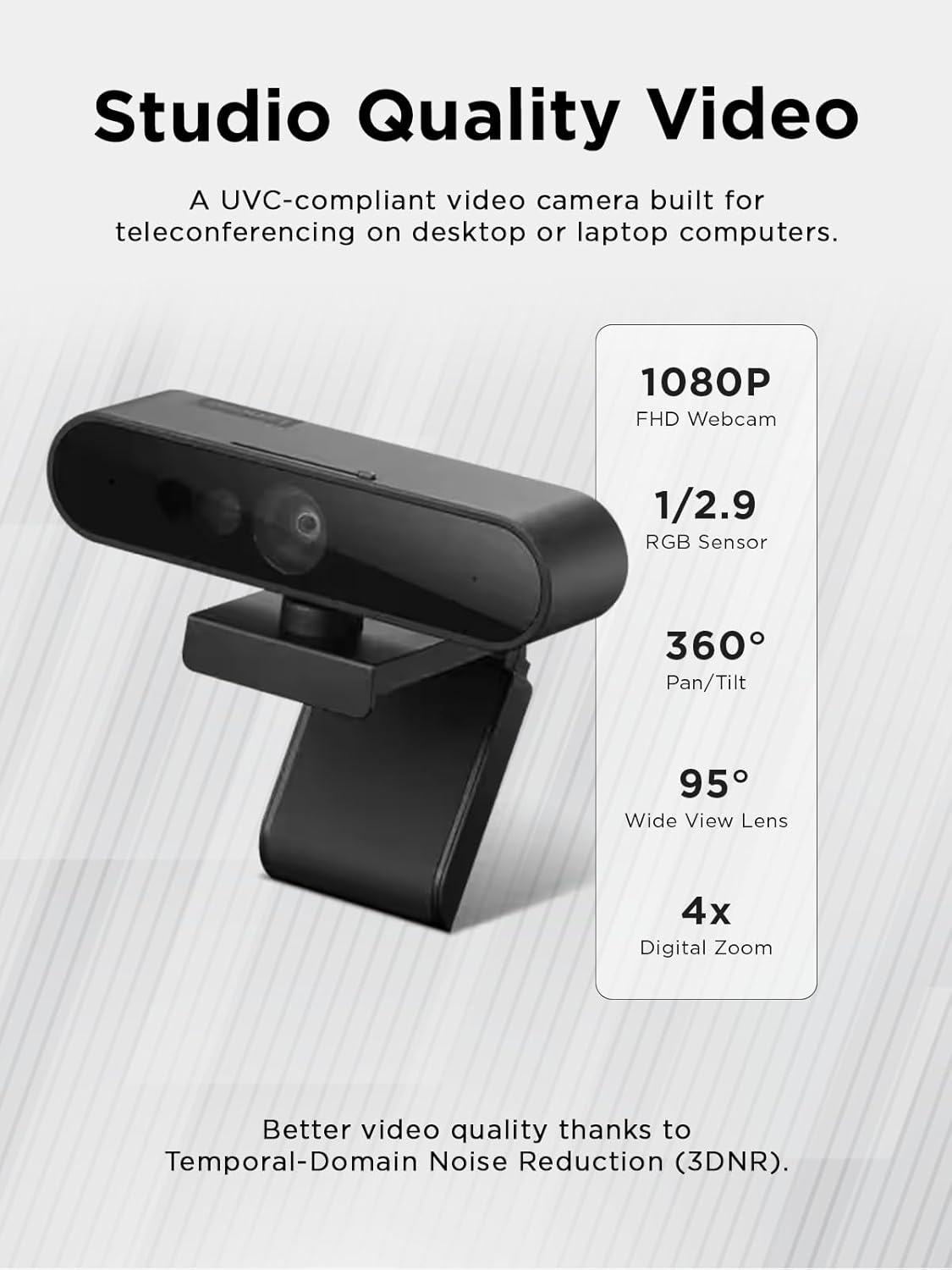 Studio-quality video conferencing – With a 1/2.9-inch RGB sensor, 95° lens, and 4x digital zoom, this 1080p FHD webcam allows users to set the scene for every call. What’s more, dual microphones pick-up voices within a 2-meter range, accurately and clearly