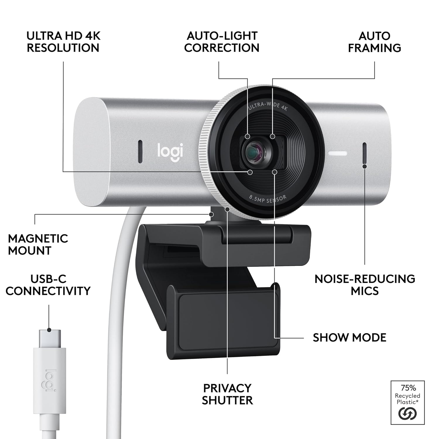 Meet, stream, master with the Logitech MX Brio Ultra HD 4K Webcam for Collaboration and Streaming. Experience sharp, ultra HD 4k resolution video with AI image enhancement, our in-house designed lens, and our most advanced webcam sensor yet with 70% bigger pixels (1) for 2X better face visibility and 2x finer image details in difficult lighting conditions.(2). Fine controls (3) on this HD webcam let you precisely adjust lighting and white balance with ISO, Shutter Speed, Temperature, Tint, and Vibrance. Dual omnidirectional microphones reduce background sound so you can be heard clearly with noise-reducing technology. Show Mode lets you share your physical work and notes on video calls by tilting the web camera down.