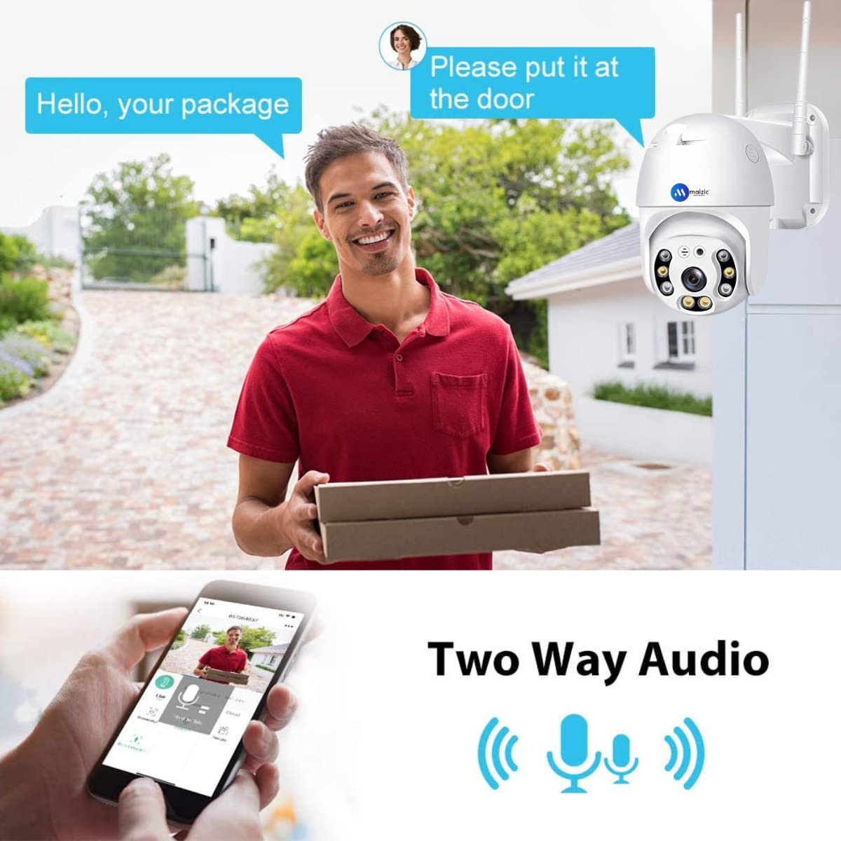 Maizic Multi-Platform: The device can be viewed on mobile (Android /IOS), tablets and laptops. Maizic Multi-User: Multiple mobiles can access a camera free of cost. Maizic 2 Minute Install: Installs in 2 minutes. Maizic No Installer Required Design: On the website and on-call step by step installation available. Mazic Plug and Pay(P2P): The box contains adapters, screws, instruction manuals so that nothing else is required to get started. Maizic Smart Alarm: Customise alerts based on motion, define area and time.MMaizic Smart Alert: Alert on app on motion detection.PPacked with additional features: 2 MP high definition lens, night vision, sd card recording (upto 128 GB, sd card not included), motion tracking, multiple cameras in one app, two-way intercom onvif complaint