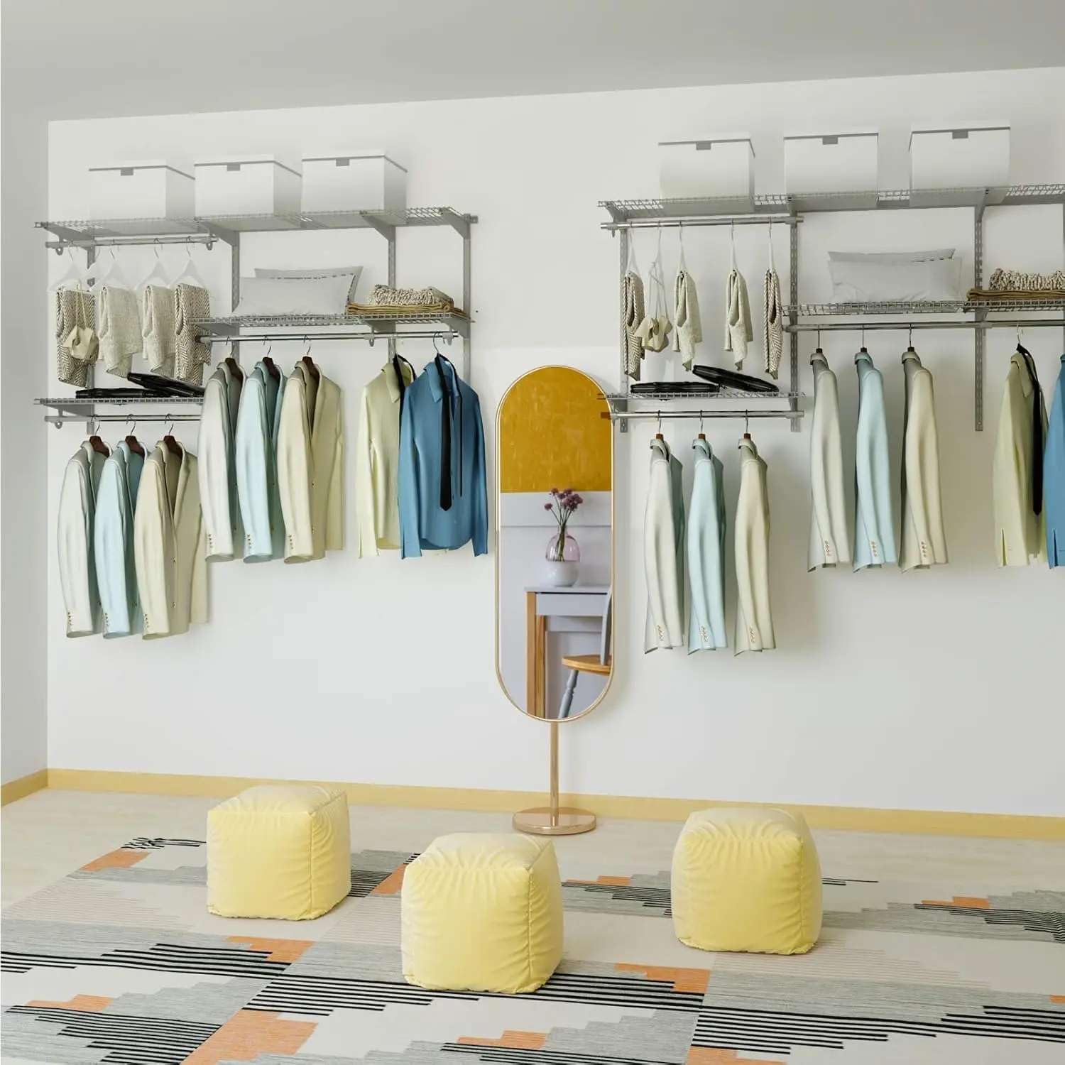 Transform your cluttered closet into a stylish and organized space with this customizable wall-mounted closet organizer system. Designed for efficient storage, it’s perfect for those seeking to optimize their closet space and simplify their daily routine.