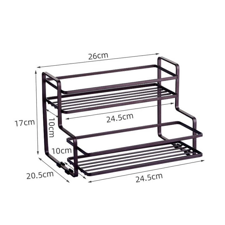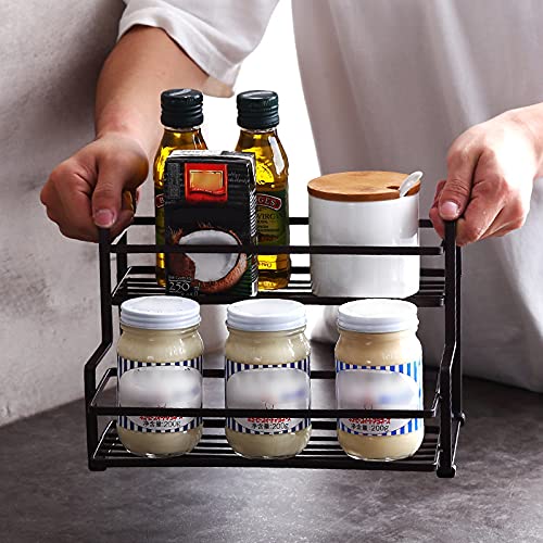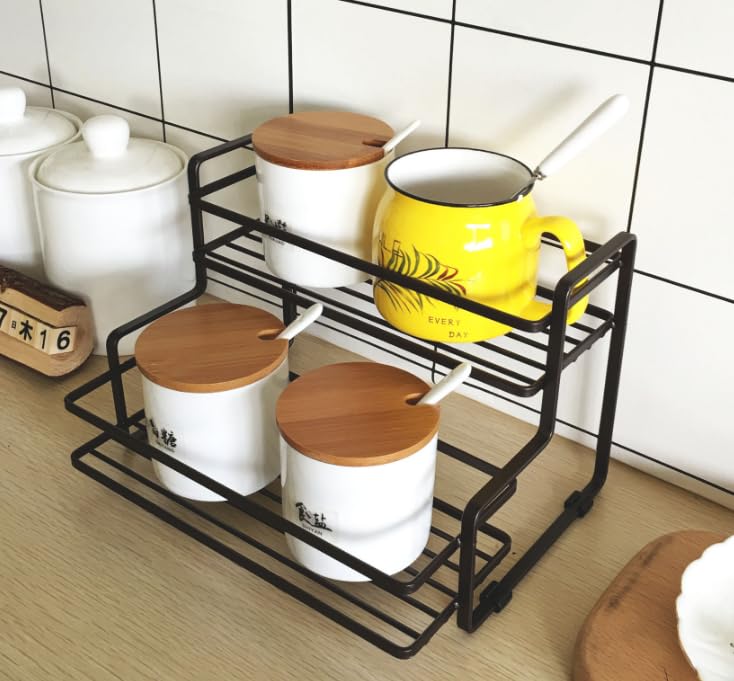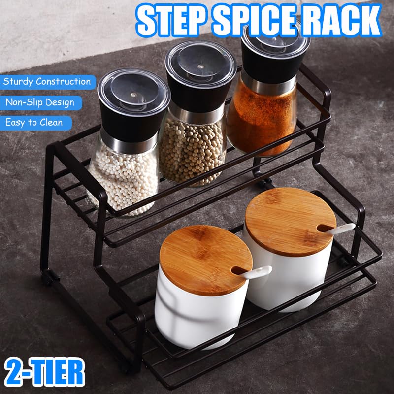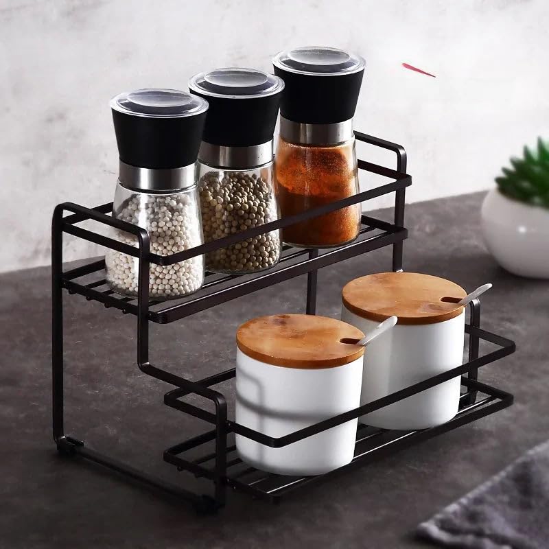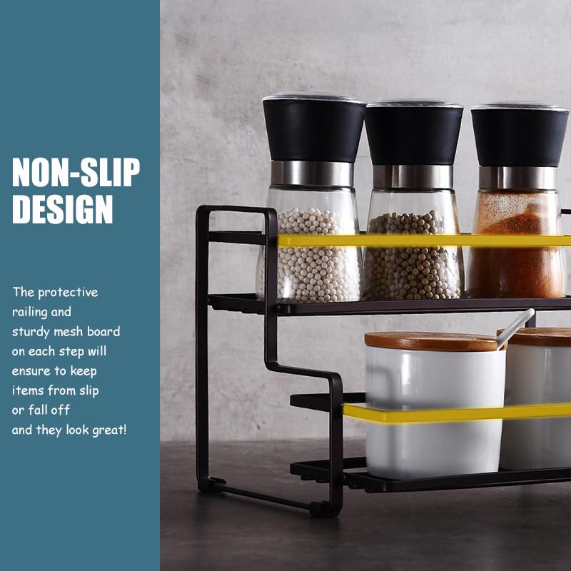 DESIGN: 2-tier metal storage rack with sleek black finish, perfect for organizing spices, condiments, and kitchen essentials in a space-saving vertical layout