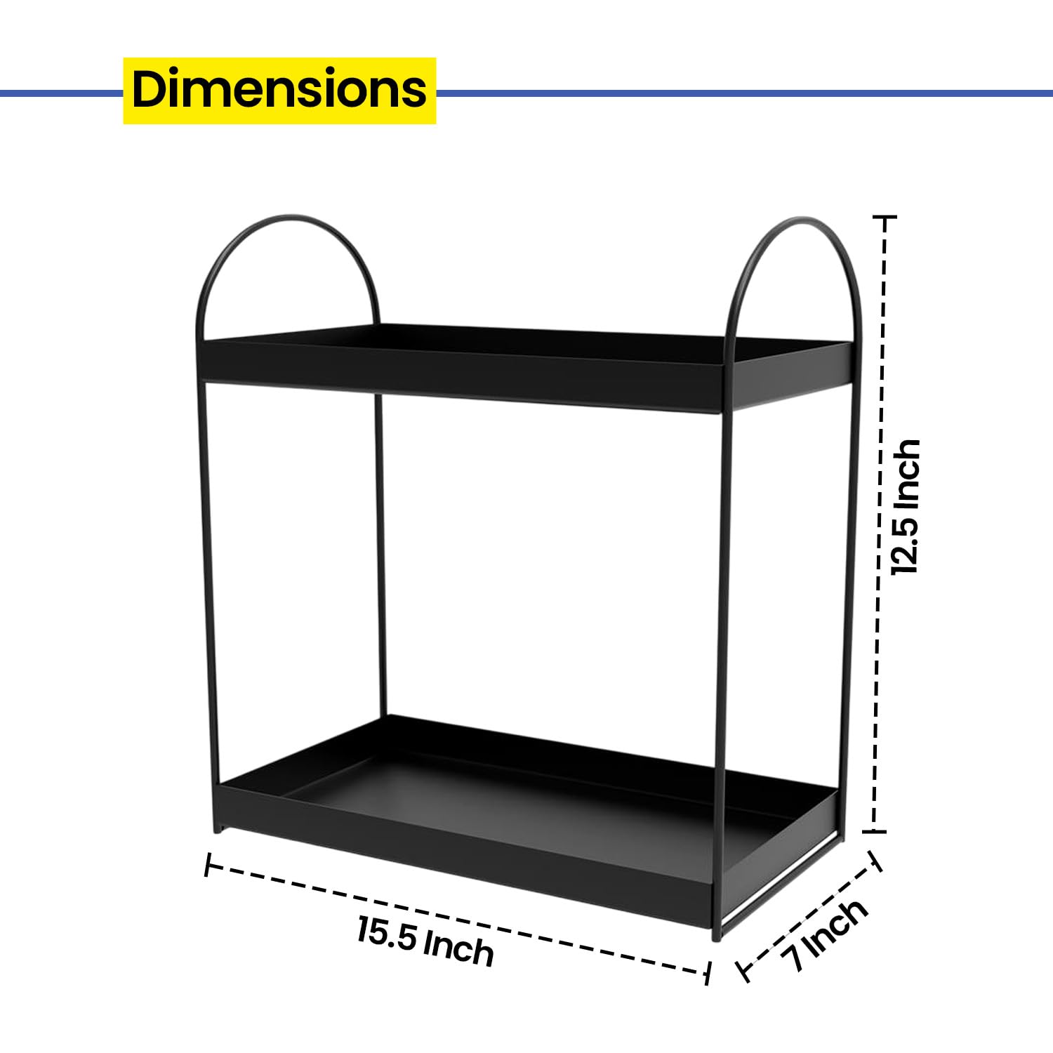 A No-assembly metal rack that is both versatile and durable for all your storage needs. Made of high-quality metal, it is designed to hold heavy items without bending or warping. Its two-tier design allows for maximum storage capacity, making it easy to organize and showcase your various items. This versatile storage rack has many uses. It serves as an excellent kitchen shelf, bathroom storage rack, living room counter shelf, pantry organizer, decorative planter storage rack, or even a garden accessory. Its compact and space-saving design makes it ideal for small or limited spaces. It’s perfect for any room in the house, whether you need extra storage in the kitchen, bathroom, garage, pantry, or office. The sleek black finish adds a modern touch to any decor style, blending seamlessly with your existing furniture and surroundings.