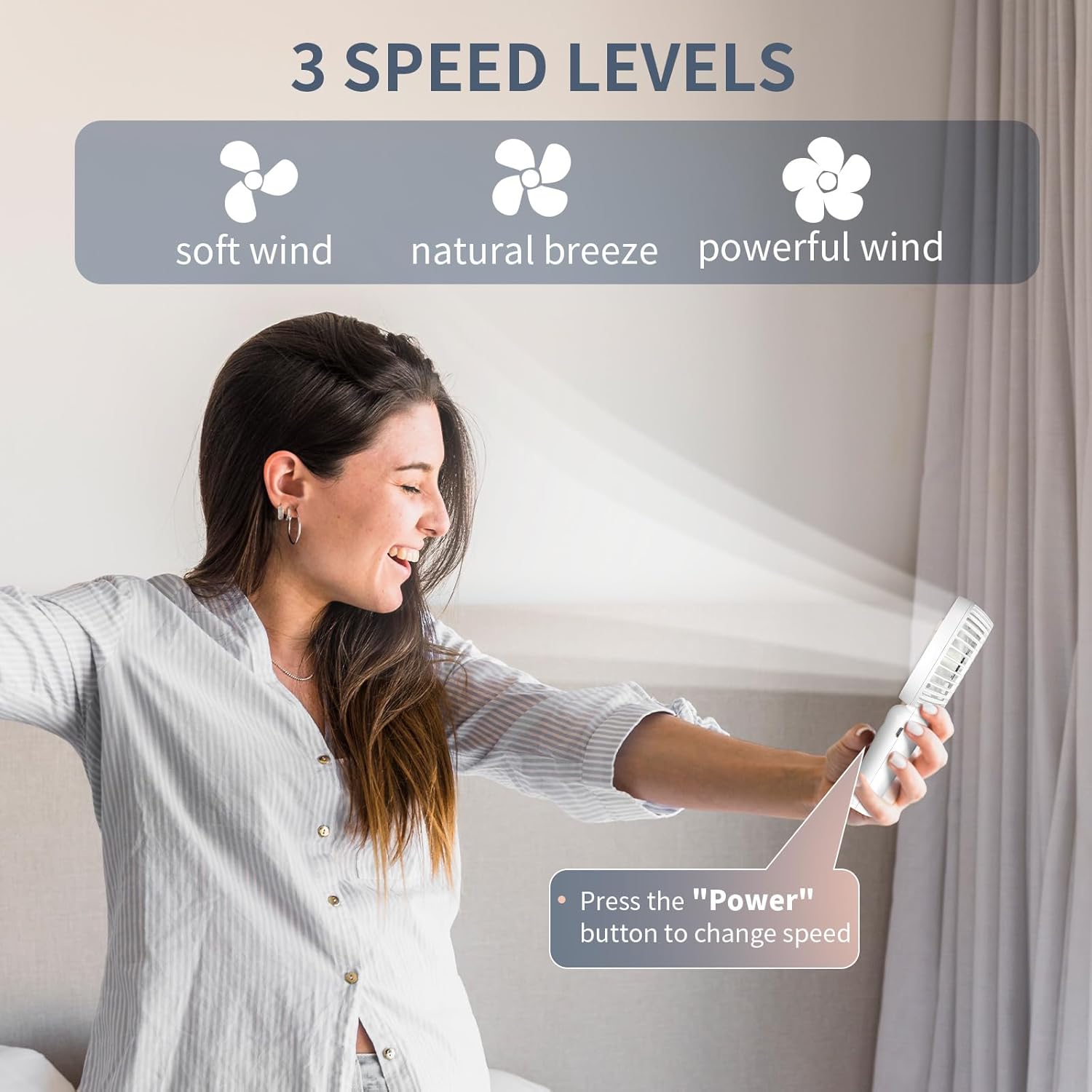 【USB Charging Fan with 3 Adjustable Speeds】Featuring a built-in 1200mAh battery, this rechargeable hand fan can be fully charged in just 3 hours via the convenient Micro USB charging port. Enjoy up to 8 hours of operation on Natural Speed, 3.5 hours on Mid Speed, and 1.5 hours on High Speed with its 3 adjustable speed settings. Whether you need a rechargeable battery fan for your office, study, or outdoor activities, this small cooling fan ensures a cool breeze whenever and wherever you need it