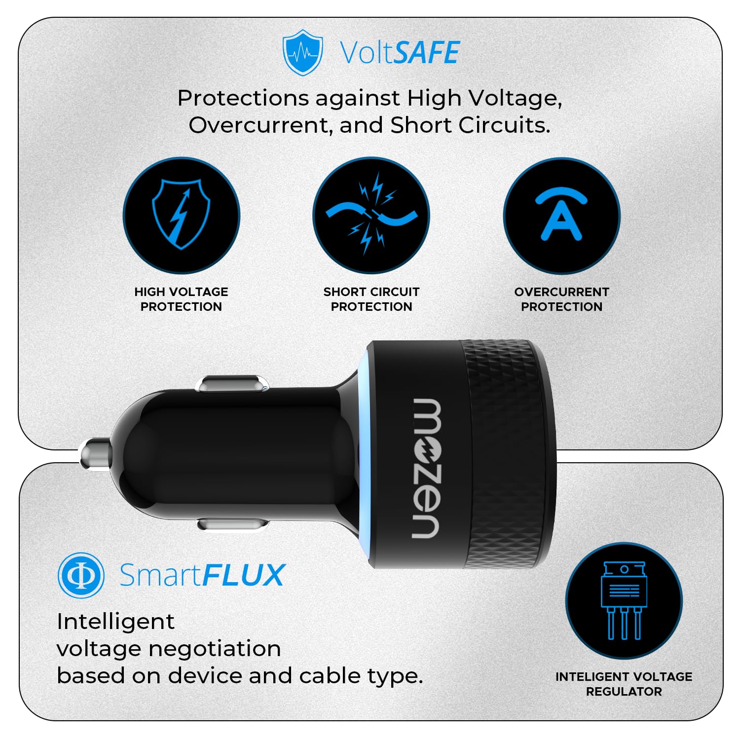 The Mozen 101W Car Charger features dual ports – USB-C 65W and USB-A 36W – delivering a combined 101W to charge laptops, tablets, and phones simultaneously. Supports PD 3.0, PPS, Samsung SFC 2.0, QC, VOOC, and SuperVOOC 100 for fast, optimized charging across major brands. VoltSafe and SmartFlux ensure safe, efficient charging. Compact, lightweight design with dual LED indicators and durable ABS-metallic build for long-lasting use.