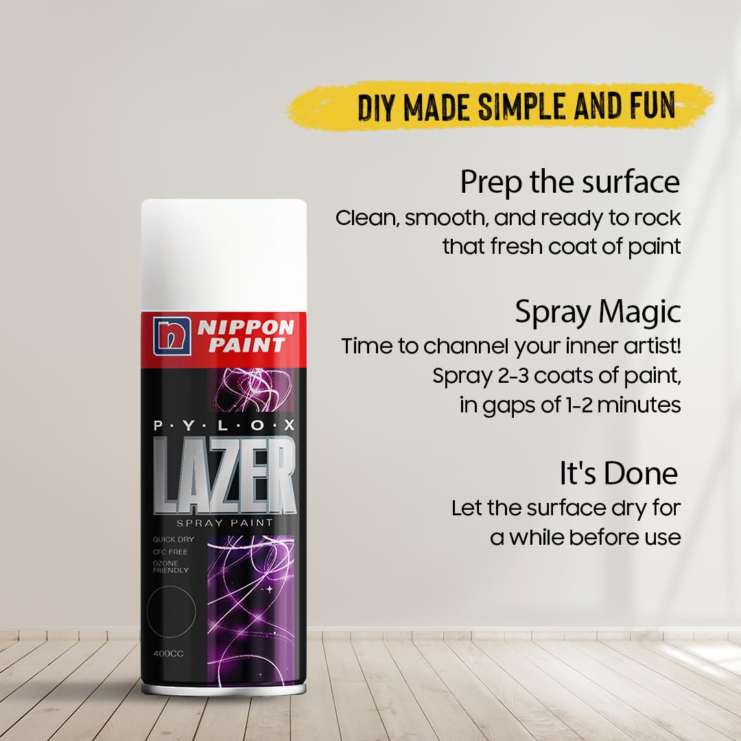 Transform your surroundings with Nippon Paint’s premium 400 ML Pylox Glossy Black Spray Paint. Asia’s #1 paint manufacturer brings you this professional-grade solution that revitalizes any surface with minimal effort – just shake, spray, and watch dull surfaces become sleek masterpieces in minutes. Perfect for home improvement, automotive touch-ups, and creative projects. The eco-friendly, CFC-free formula with reduced odor works indoors while ensuring smooth, streak-free coverage. Experience the superior durability and luxurious finish that makes Nippon Paint the trusted choice across Asia.